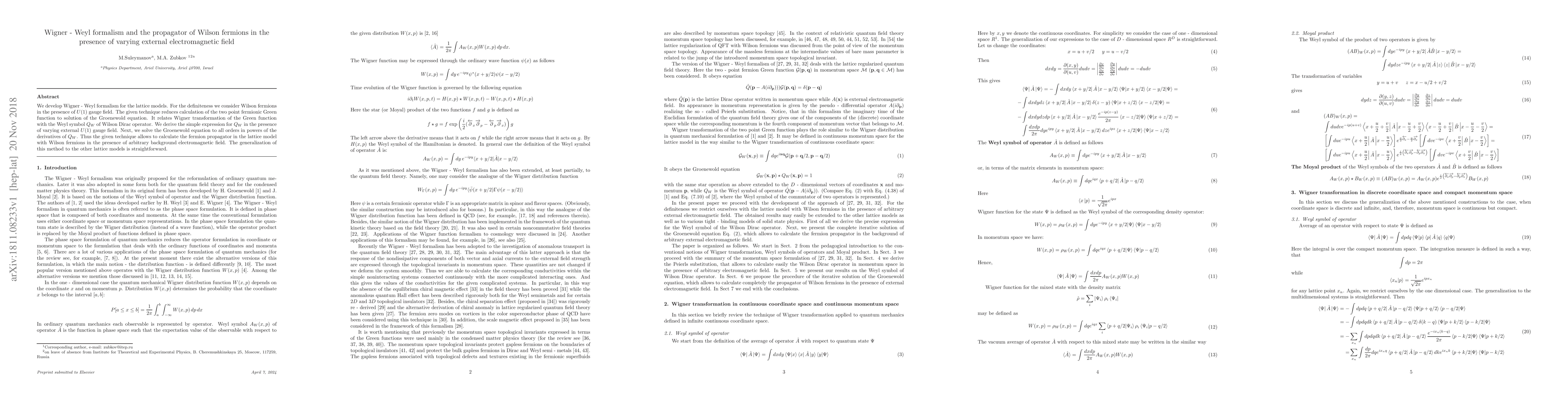 We develop Wigner - Weyl formalism for the lattice models. For the definiteness we consider Wilson fermions in the presence of $U(1)$ gauge field. The given technique reduces calculation of the two point fermionic Green function to solution of the Groenewold equation. It relates Wigner transformation of the Green function with the Weyl symbol $Q_W$ of Wilson Dirac operator. We derive the simple expression for $Q_W$ in the presence of varying external $U(1)$ gauge field. Next, we solve the Groenewold equation to all orders in powers of the derivatives of $Q_W$. Thus the given technique allows to calculate the fermion propagator in the lattice model with Wilson fermions in the presence of arbitrary background electromagnetic field. The generalization of this method to the other lattice models is straightforward.