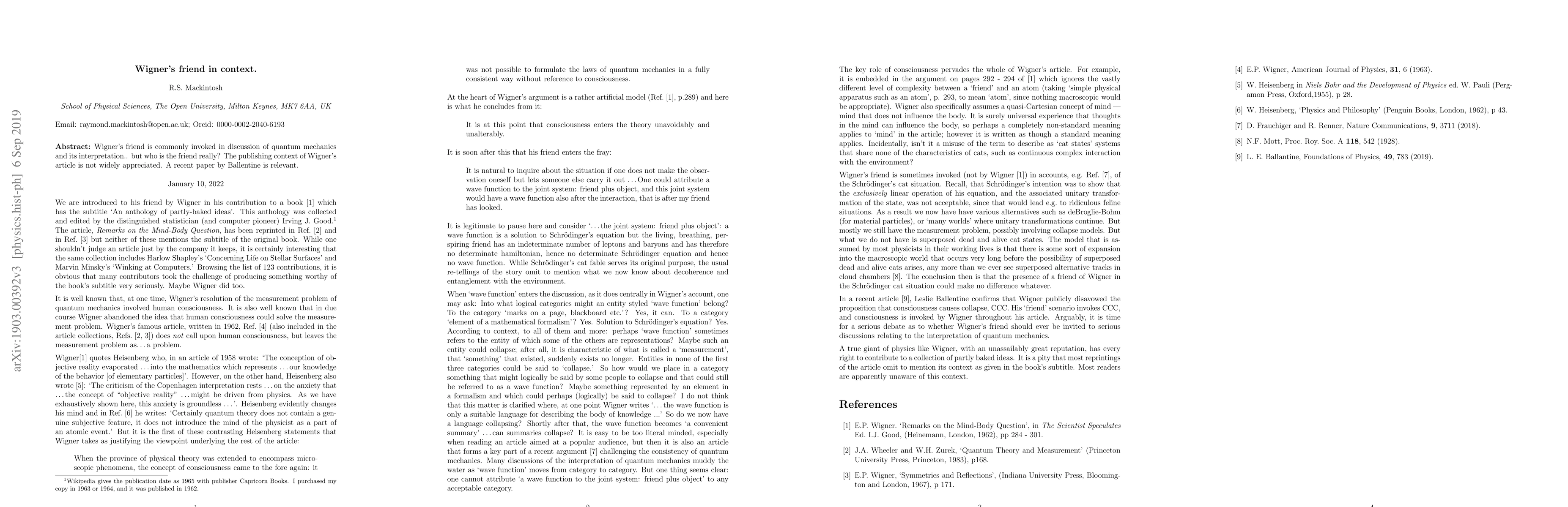 Wigner's friend is commonly invoked in discussion of quantum mechanics and its interpretation.. but who is the friend really? The publishing context of Wigner's article is not widely appreciated. A recent paper by Ballentine is relevant.