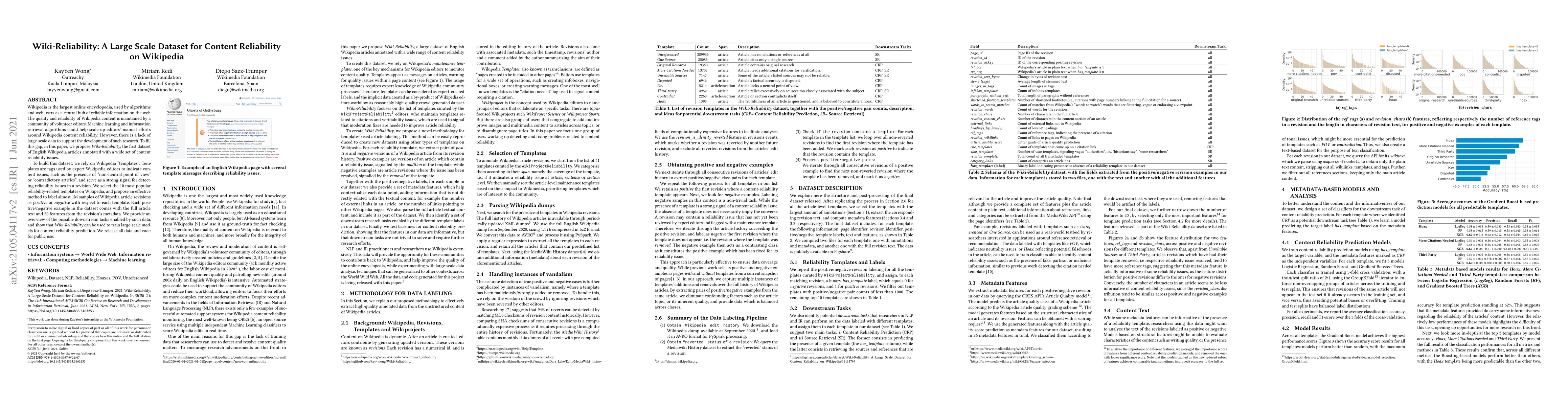 This paper introduces Wiki-Reliability, a large-scale dataset for assessing content reliability in English Wikipedia articles, annotated with issues identified by expert editors using reliability-related templates. The dataset includes nearly 1M article revisions labeled with metadata and features, aiming to support machine learning models for predicting content reliability.