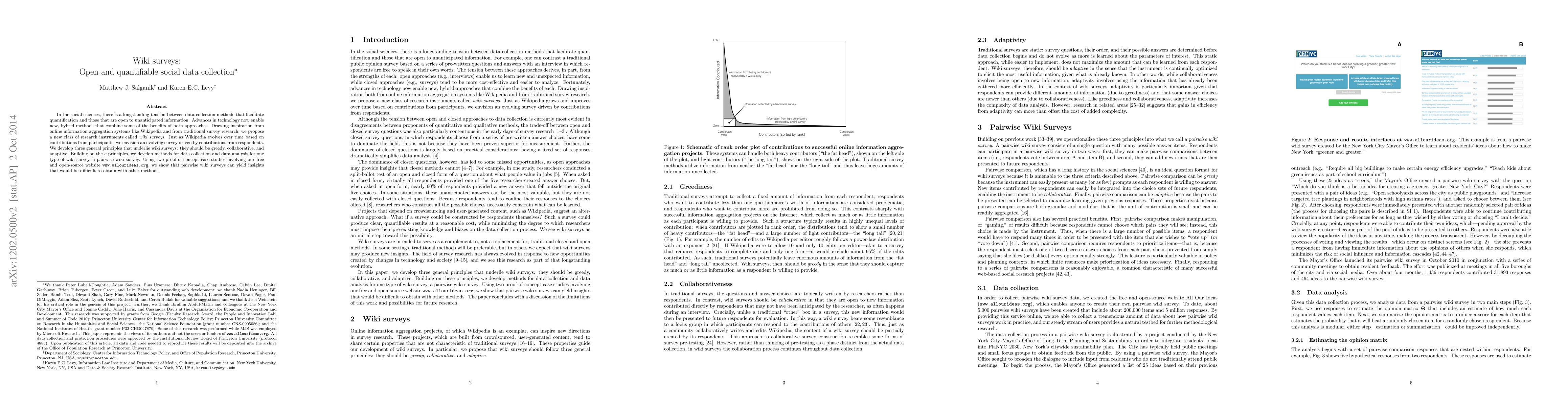 This paper proposes wiki surveys as a hybrid data collection method combining openness with quantification, yielding insightful results from collaborative and adaptive online contributions.
