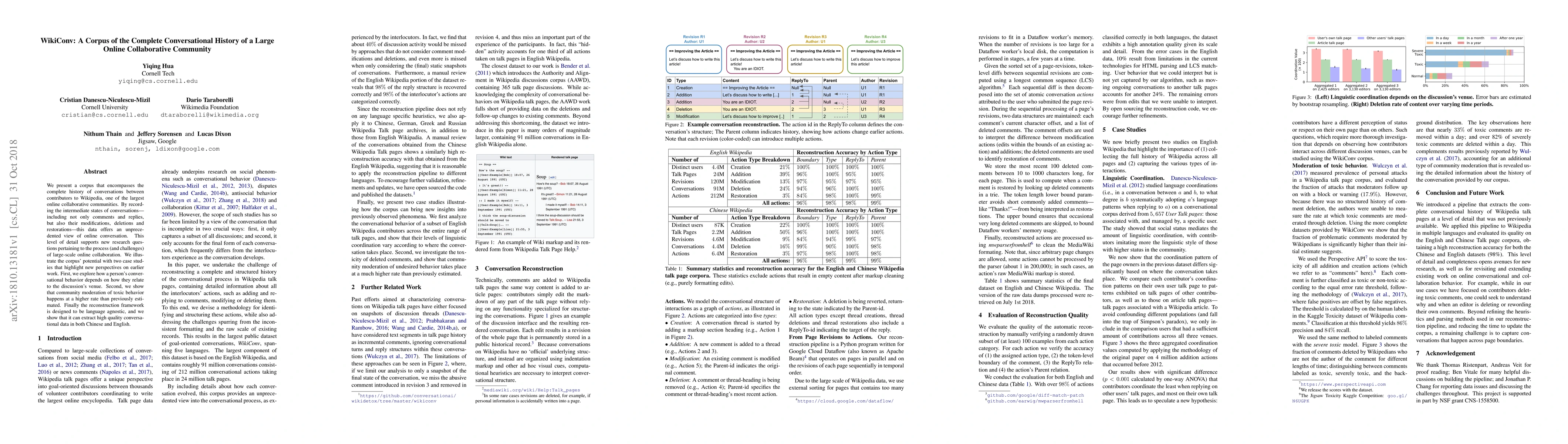 WikiConv provides a comprehensive corpus of Wikipedia's entire conversational history, including edits and deletions, offering insights into large-scale online collaboration. The corpus reveals new perspectives on user behavior and higher rates of community moderation against toxic behavior, demonstrating its potential for diverse language applications.
