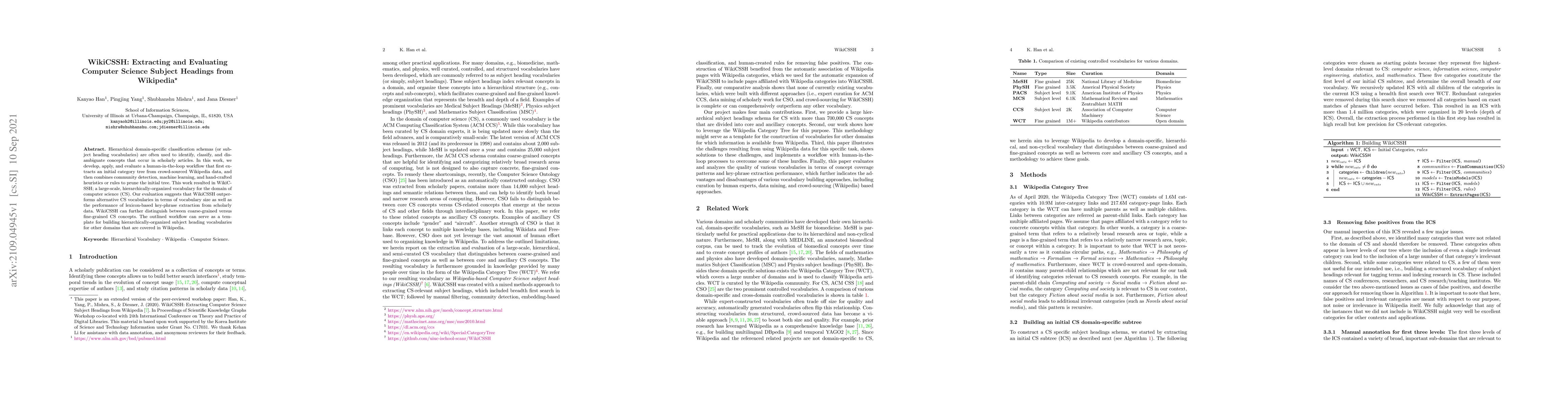 Hierarchical domain-specific classification schemas (or subject heading vocabularies) are often used to identify, classify, and disambiguate concepts that occur in scholarly articles. In this work, we develop, apply, and evaluate a human-in-the-loop workflow that first extracts an initial category tree from crowd-sourced Wikipedia data, and then combines community detection, machine learning, and hand-crafted heuristics or rules to prune the initial tree. This work resulted in WikiCSSH; a large-scale, hierarchically organized vocabulary for the domain of computer science (CS). Our evaluation suggests that WikiCSSH outperforms alternative CS vocabularies in terms of vocabulary size as well as the performance of lexicon-based key-phrase extraction from scholarly data. WikiCSSH can further distinguish between coarse-grained versus fine-grained CS concepts. The outlined workflow can serve as a template for building hierarchically-organized subject heading vocabularies for other domains that are covered in Wikipedia.