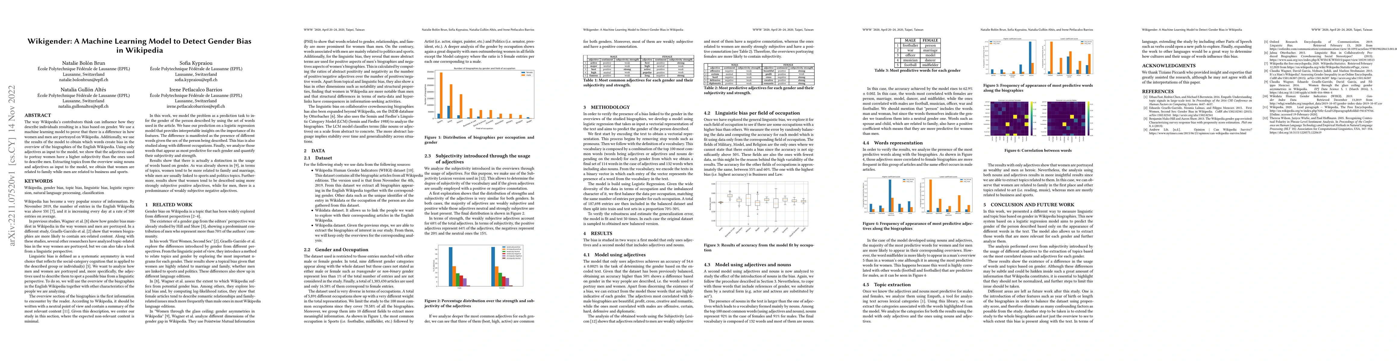 This paper presents a machine learning model to detect gender bias in Wikipedia, showing that women are portrayed with more subjective adjectives and are associated with family, while men are linked to business and sports. The study highlights the disparity in how genders are described in Wikipedia biographies.