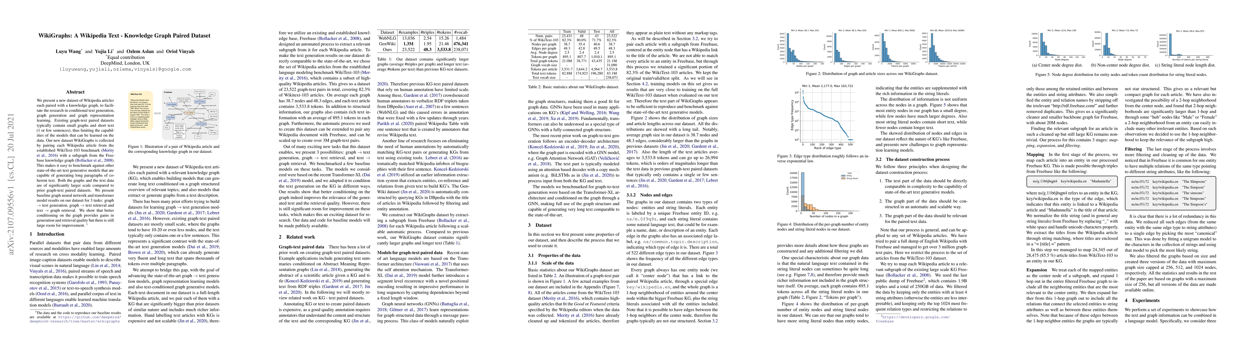 WikiGraphs is a new dataset pairing Wikipedia articles with Freebase knowledge graphs to advance research in conditional text generation, graph generation, and graph representation learning. The dataset enables benchmarking against state-of-the-art text generative models, showing improved performance with better graph conditioning, though room for further enhancement remains.