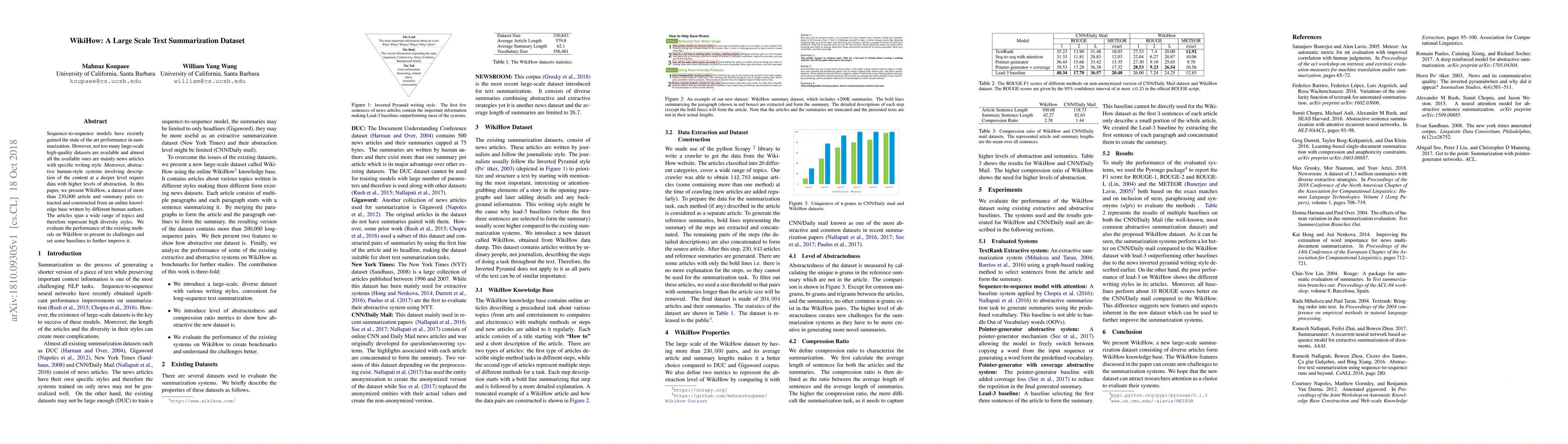 This paper introduces WikiHow, a large-scale dataset of over 230,000 article-summary pairs from an online knowledge base, aiming to address the lack of diverse, high-quality summarization datasets. The authors evaluate existing summarization methods on this dataset to highlight its challenges and establish baselines for future improvements.