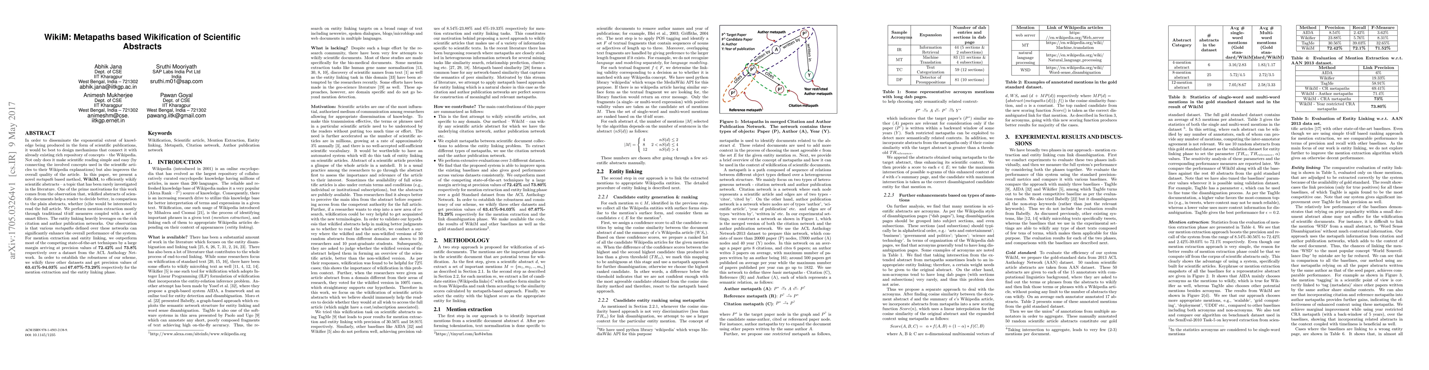 In order to disseminate the exponential extent of knowledge being produced in the form of scientific publications, it would be best to design mechanisms that connect it with already existing rich repository of concepts -- the Wikipedia. Not only does it make scientific reading simple and easy (by connecting the involved concepts used in the scientific articles to their Wikipedia explanations) but also improves the overall quality of the article. In this paper, we present a novel metapath based method, WikiM, to efficiently wikify scientific abstracts -- a topic that has been rarely investigated in the literature. One of the prime motivations for this work comes from the observation that, wikified abstracts of scientific documents help a reader to decide better, in comparison to the plain abstracts, whether (s)he would be interested to read the full article. We perform mention extraction mostly through traditional tf-idf measures coupled with a set of smart filters. The entity linking heavily leverages on the rich citation and author publication networks. Our observation is that various metapaths defined over these networks can significantly enhance the overall performance of the system. For mention extraction and entity linking, we outperform most of the competing state-of-the-art techniques by a large margin arriving at precision values of 72.42% and 73.8% respectively over a dataset from the ACL Anthology Network. In order to establish the robustness of our scheme, we wikify three other datasets and get precision values of 63.41%-94.03% and 67.67%-73.29% respectively for the mention extraction and the entity linking phase.