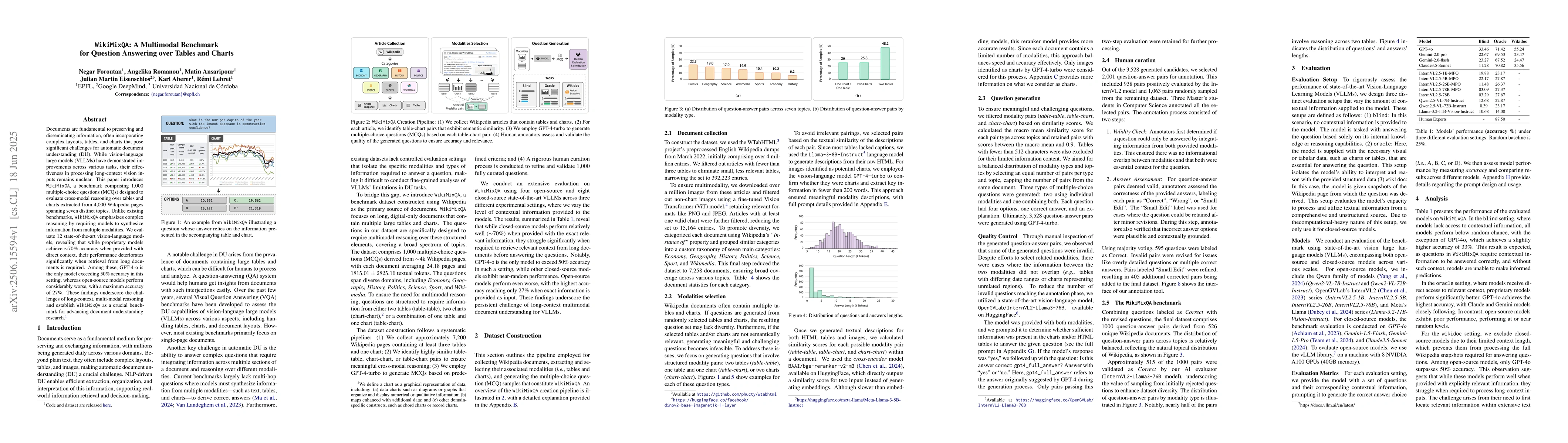 The paper introduces WikiMixQA, a benchmark with 1,000 multiple-choice questions based on tables and charts from 4,000 Wikipedia pages. It evaluates 12 vision-language models, finding that while proprietary models perform well with direct context, their accuracy drops significantly when dealing with long documents, with GPT-4-o being the only model exceeding 50% accuracy in this challenging setting. This highlights difficulties in long-context, multi-modal reasoning and establishes WikiMixQA as a crucial benchmark for document understanding research.