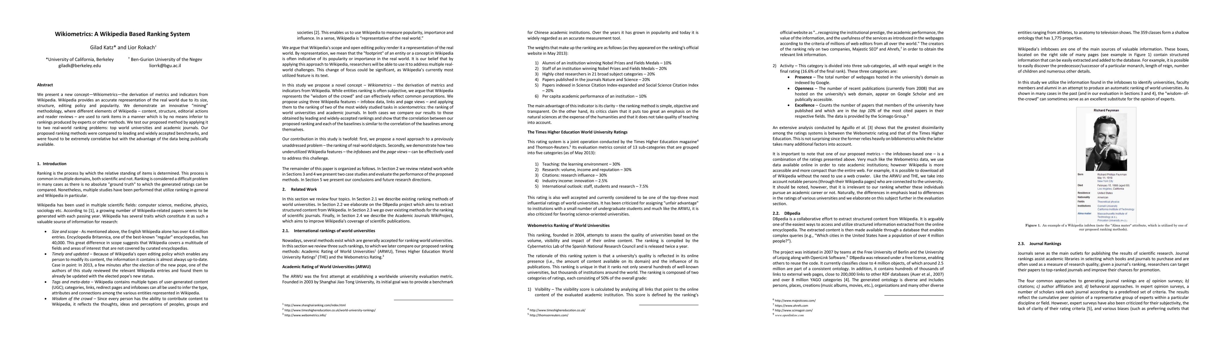 Wikiometrics introduces a novel ranking system derived from Wikipedia, leveraging its vast content, structure, editorial actions, and reader reviews. This method ranks world universities and academic journals, demonstrating strong correlation with expert-based rankings while offering publicly accessible data.