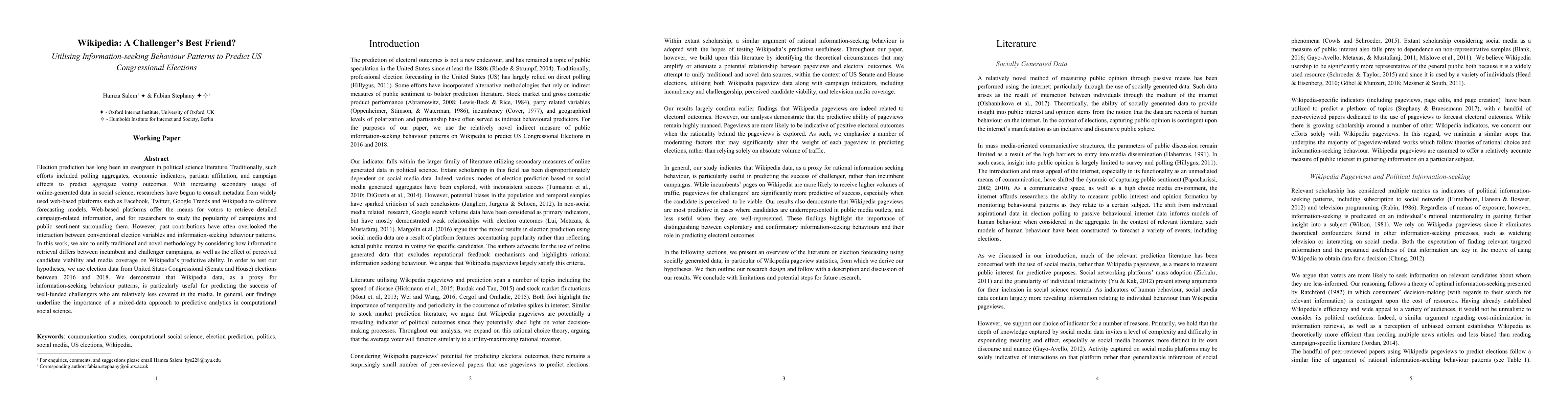 This study explores how information-seeking behaviour patterns on Wikipedia can predict US Congressional election outcomes, particularly for well-funded challengers with less media coverage. It finds that Wikipedia pageviews serve as a useful proxy for gauging public interest and can enhance traditional election prediction models.