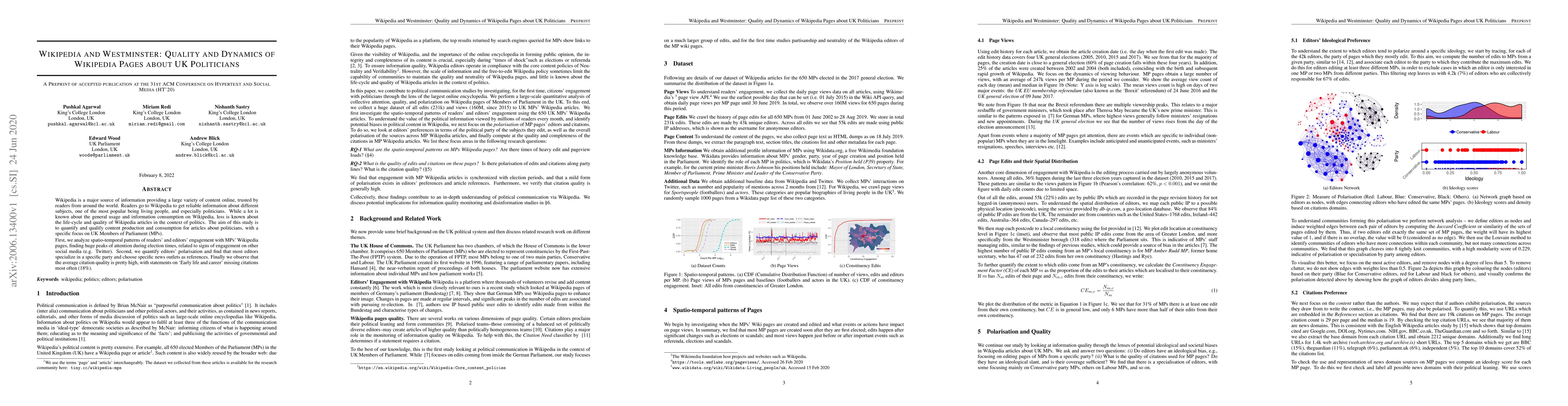 This study examines the dynamics of Wikipedia pages on UK politicians, focusing on Members of Parliament (MPs). It reveals significant peaks in reader and editor engagement during election periods, alongside editor polarization favoring specific parties and news sources. The study concludes that while citation quality is generally high, sections on 'Early life and career' often lack citations.