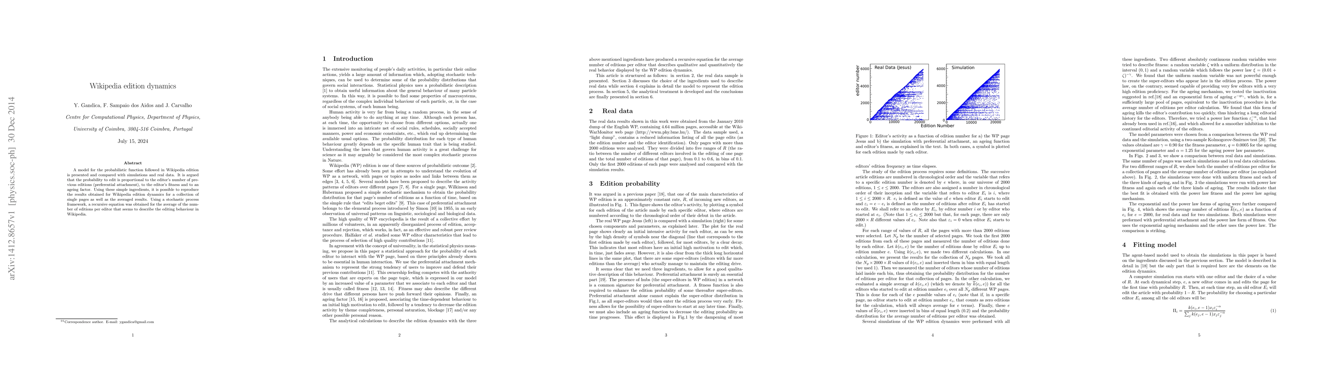 This paper proposes a probabilistic model for Wikipedia edition dynamics, demonstrating that the likelihood of an edit is influenced by the editor's previous edits, their fitness, and an ageing factor. The model effectively reproduces observed editing behaviors both for individual pages and averaged results.
