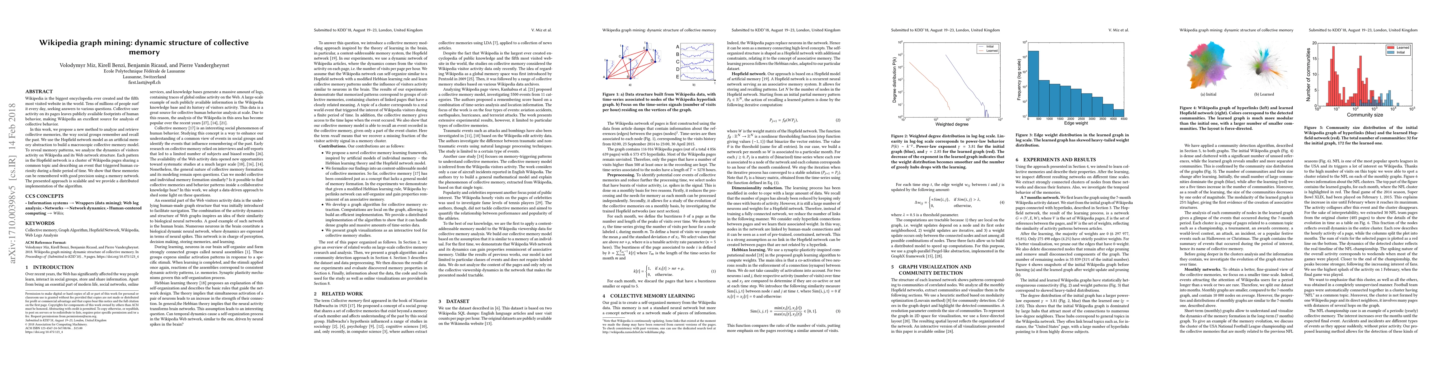 Wikipedia is the biggest encyclopedia ever created and the fifth most visited website in the world. Tens of millions of people surf it every day, seeking answers to various questions. Collective user activity on its pages leaves publicly available footprints of human behavior, making Wikipedia an excellent source for analysis of collective behavior. In this work, we propose a distributed graph-based event extraction model, inspired by the Hebbian learning theory. The model exploits collective effect of the dynamics to discover events. We focus on data-streams with underlying graph structure and perform several large-scale experiments on the Wikipedia visitor activity data. We show that the presented model is scalable regarding time-series length and graph density, providing a distributed implementation of the proposed algorithm. We extract dynamical patterns of collective activity and demonstrate that they correspond to meaningful clusters of associated events, reflected in the Wikipedia articles. We also illustrate evolutionary dynamics of the graphs over time to highlight changing nature of visitors' interests. Finally, we discuss clusters of events that model collective recall process and represent collective memories - common memories shared by a group of people.