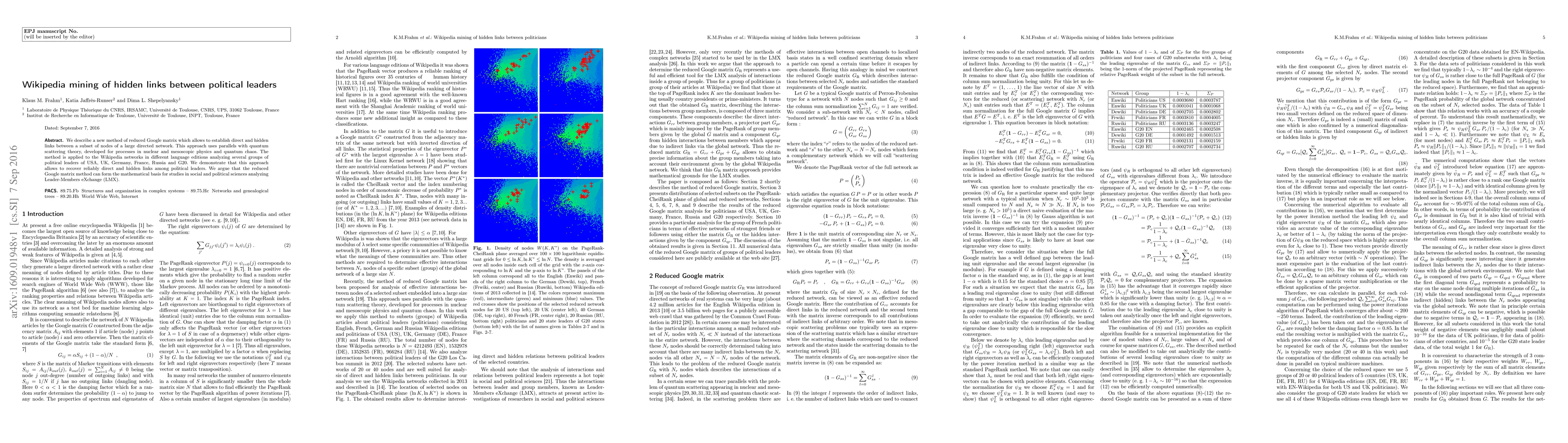 We describe a new method of reduced Google matrix which allows to establish direct and hidden links between a subset of nodes of a large directed network. This approach uses parallels with quantum scattering theory, developed for processes in nuclear and mesoscopic physics and quantum chaos. The method is applied to the Wikipedia networks in different language editions analyzing several groups of political leaders of USA, UK, Germany, France, Russia and G20. We demonstrate that this approach allows to recover reliably direct and hidden links among political leaders. We argue that the reduced Google matrix method can form the mathematical basis for studies in social and political sciences analyzing Leader-Members eXchange (LMX).