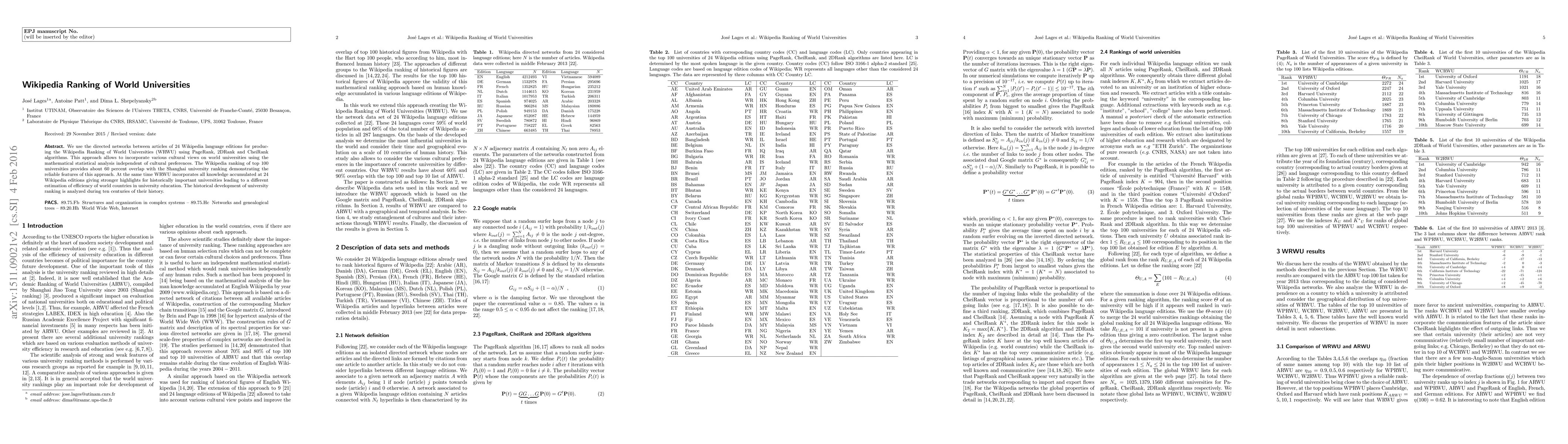 This research develops the Wikipedia Ranking of World Universities (WRWU) using PageRank, 2DRank, and CheiRank algorithms based on directed networks from 24 Wikipedia language editions. It shows a 60% overlap with the Shanghai ranking, highlighting historically significant universities and offering a culturally neutral assessment of global university education.