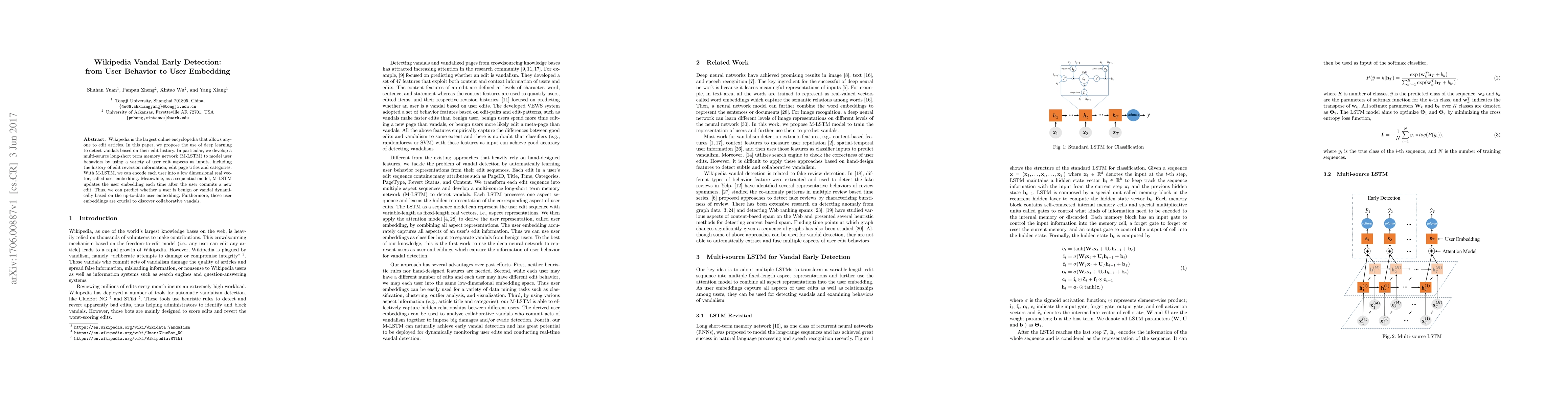 A multi-source LSTM model was developed to encode user behavior into user embeddings for Wikipedia vandalism detection.