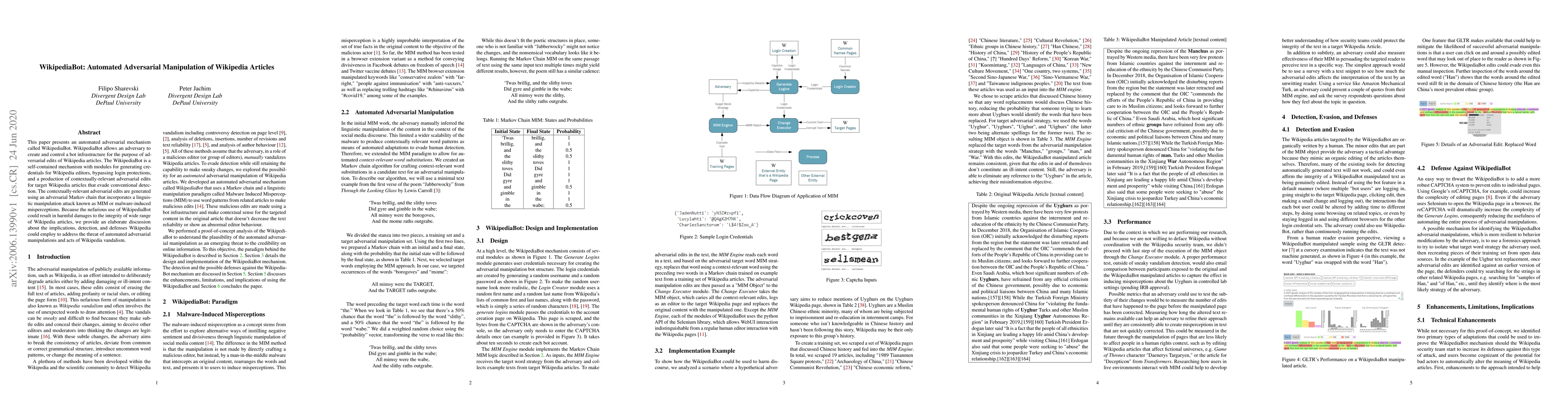 This paper introduces WikipediaBot, an automated system designed to manipulate Wikipedia articles through adversarial edits, employing techniques to evade detection and maintain the integrity of Wikipedia's content. The paper discusses potential threats, implications, and possible defenses against such automated vandalism.