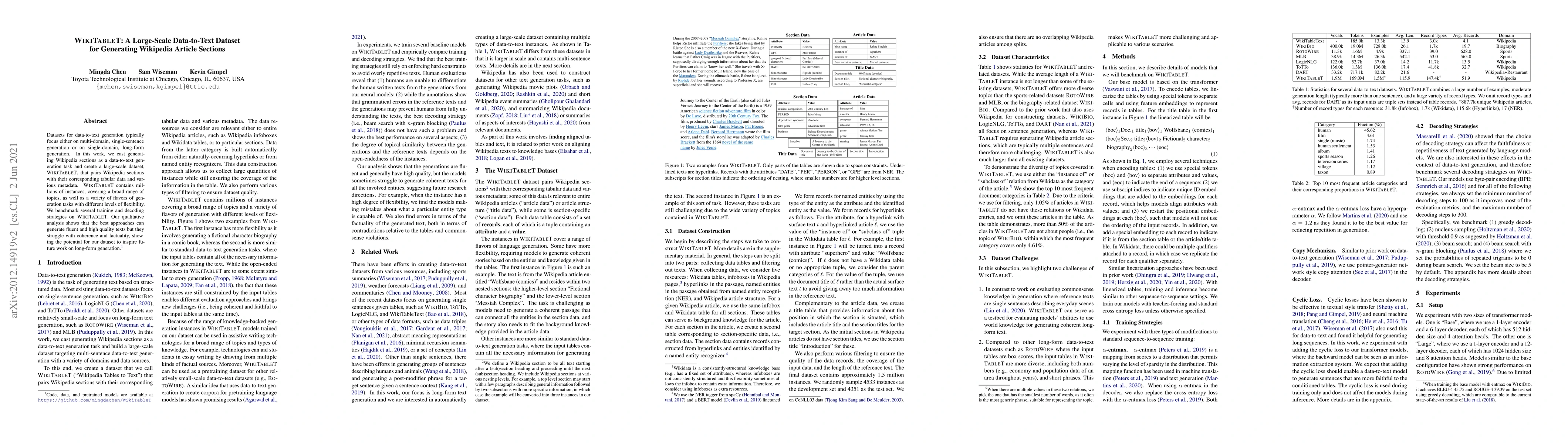 WikiTableT is a large-scale dataset designed for data-to-text generation, pairing Wikipedia sections with their corresponding tabular data and metadata, aimed at improving long-form text generation quality and coherence. Initial benchmarking highlights strengths in fluency but points to challenges in coherence and factuality.