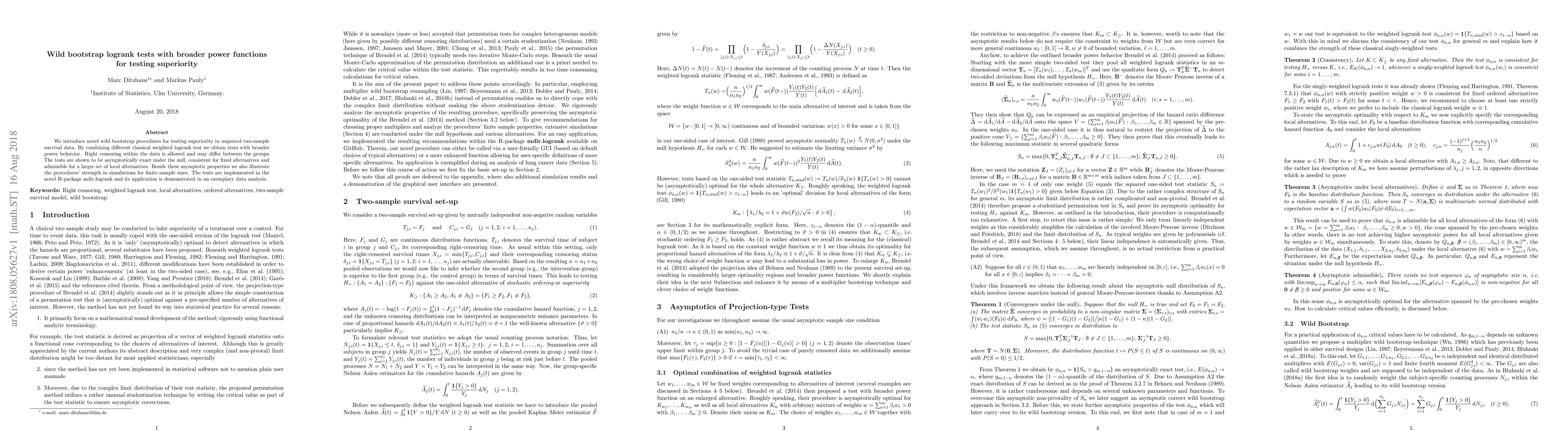 We introduce novel wild bootstrap procedures for testing superiority in unpaired two-sample survival data. By combining different classical weighted logrank test we obtain tests with broader power behavior. Right censoring within the data is allowed and may differ between the groups. The tests are shown to be asymptotically exact under the null, consistent for fixed alternatives and admissible for a larger set of local alternatives. Beside these asymptotic properties we also illustrate the procedures' strength in simulations for finite sample sizes. The tests are implemented in the novel R-package mdir.logrank and its application is demonstrated in an exemplary data analysis.