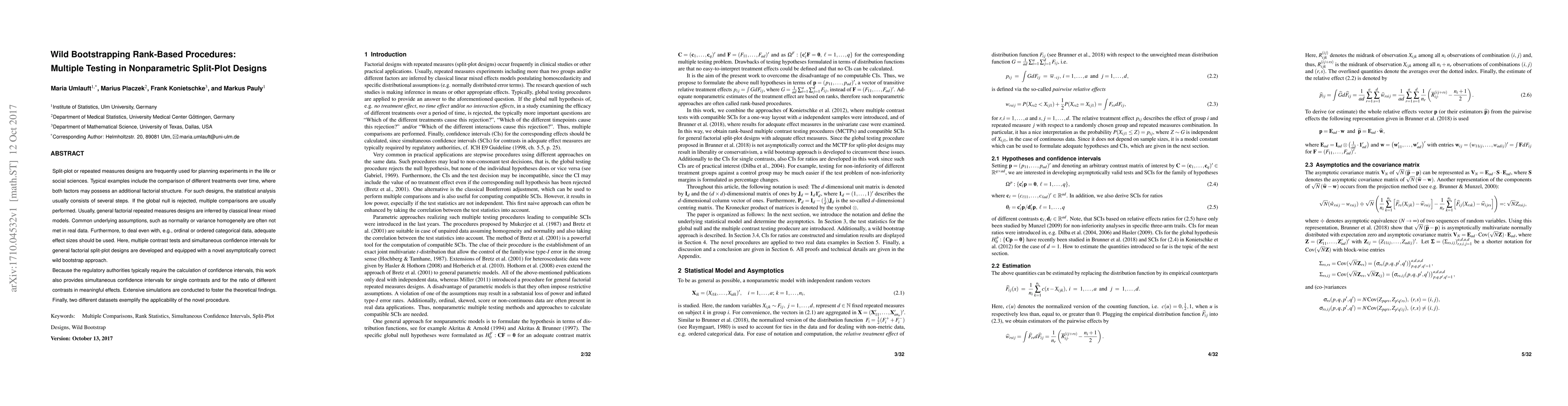 This paper develops wild bootstrapping rank-based procedures for multiple testing in nonparametric split-plot designs, providing simultaneous confidence intervals for contrasts and their ratios, validated through extensive simulations and exemplified with real datasets.