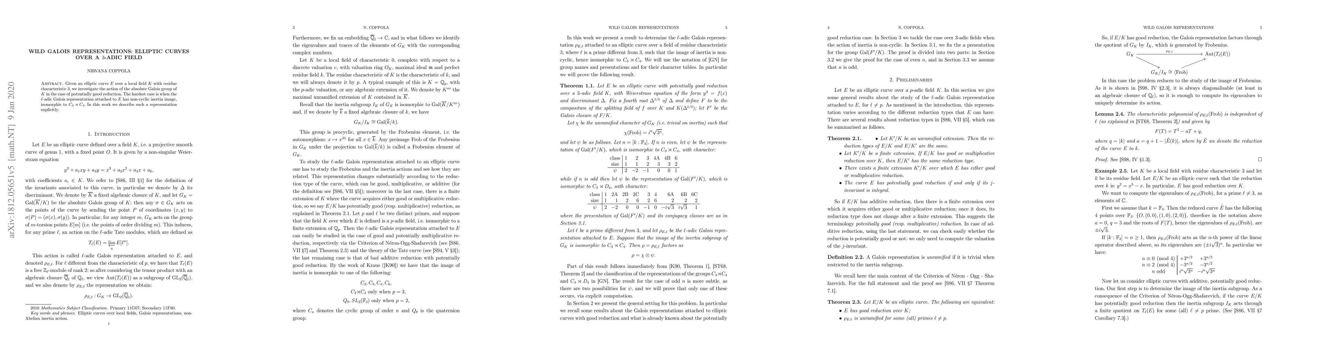 This paper investigates the action of the Galois group on an elliptic curve $E$ over a $3$-adic field $K$ with potentially good reduction, focusing on the $\ell$-adic Galois representation where the image of the inertia group is non-cyclic and isomorphic to $C_3 \rtimes C_4$. The authors explicitly describe this representation.