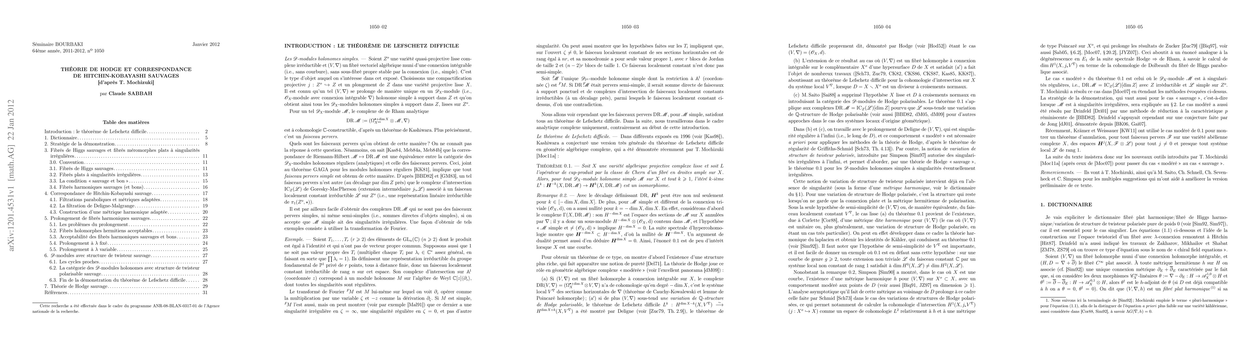 T. Mochizuki constructs a theory of variations of wild Hodge structure for which the underlying flat connection can have irregular singularities at infinity. He extends in this way the correspondence of Corlette and Simpson between irreducible flat bundles and stables Higgs bundles, taking into account objects with irregular singularities. As an application, he proves a conjecture of Kashiwara concerning a generalization of the Hard Lefschetz theorem when the coefficients are the de Rham complex of a simple holonomic D-module on smooth complex projective variety.