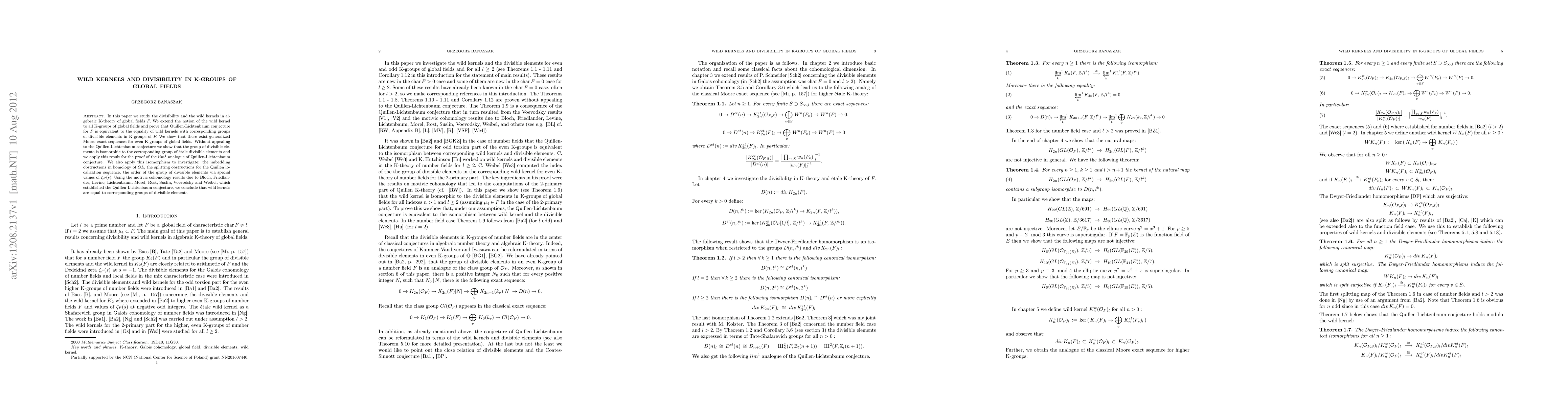 In this paper we study the divisibility and the wild kernels in algebraic K-theory of global fields $F.$ We extend the notion of the wild kernel to all K-groups of global fields and prove that Quillen-Lichtenbaum conjecture for $F$ is equivalent to the equality of wild kernels with corresponding groups of divisible elements in K-groups of $F.$ We show that there exist generalized Moore exact sequences for even K-groups of global fields. Without appealing to the Quillen-Lichtenbaum conjecture we show that the group of divisible elements is isomorphic to the corresponding group of \' etale divisible elements and we apply this result for the proof of the $lim^1$ analogue of Quillen-Lichtenbaum conjecture. We also apply this isomorphism to investigate: the imbedding obstructions in homology of $GL,$ the splitting obstructions for the Quillen localization sequence, the order of the group of divisible elements via special values of $\zeta_{F}(s).$ Using the motivic cohomology results due to Bloch, Friedlander, Levine, Lichtenbaum, Morel, Rost, Suslin, Voevodsky and Weibel, which established the Quillen-Lichtenbaum conjecture, we conclude that wild kernels are equal to corresponding groups of divisible elements