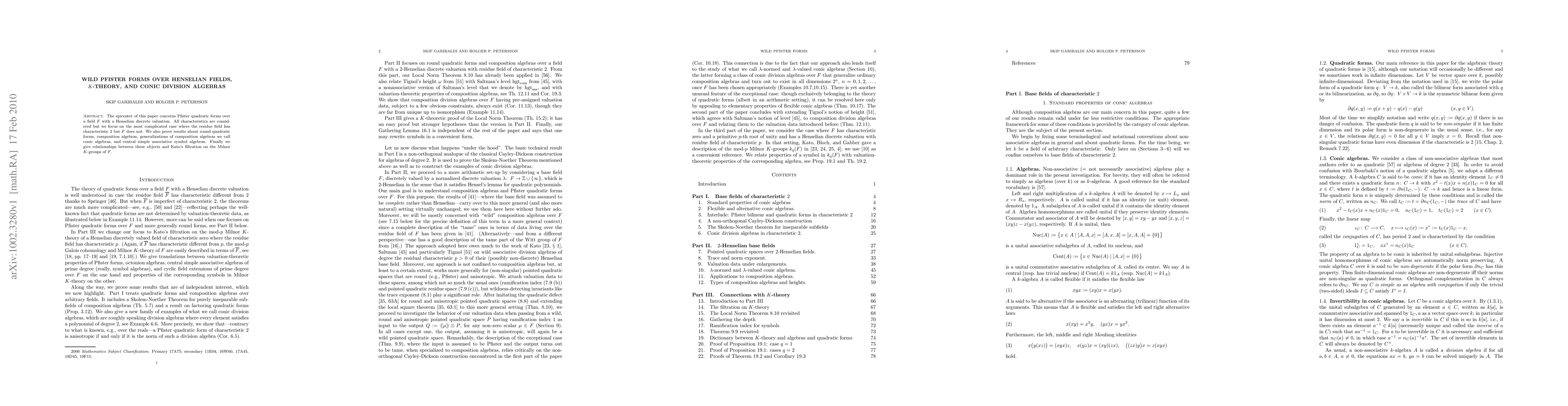 This paper investigates Pfister quadratic forms over Henselian fields with Henselian discrete valuations, particularly focusing on the case where the residue field has characteristic 2. It also explores connections to K-theory, conic division algebras, and Kato's filtration on Milnor K-groups.