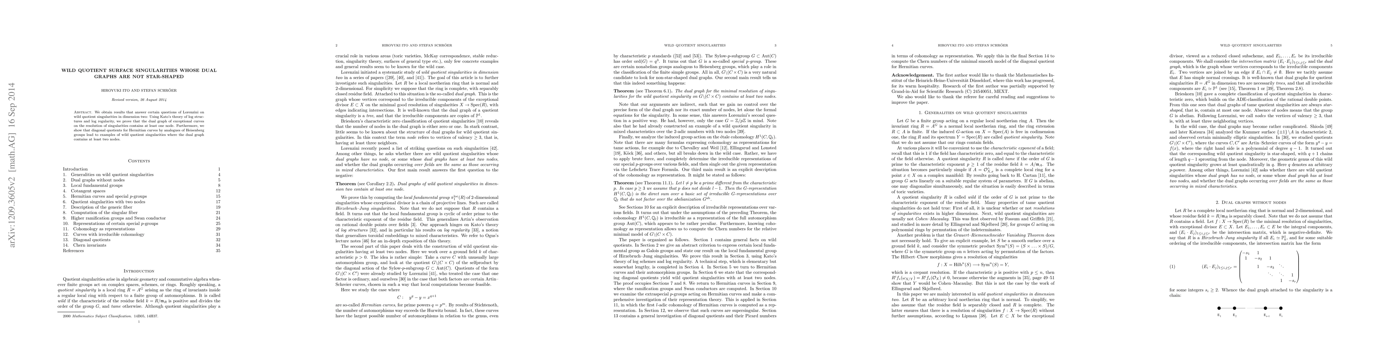 The work extends previous results by Lorenzini on wild quotient singularities, providing new examples and proofs that the dual graphs contain at least two nodes for certain quotient singularities.