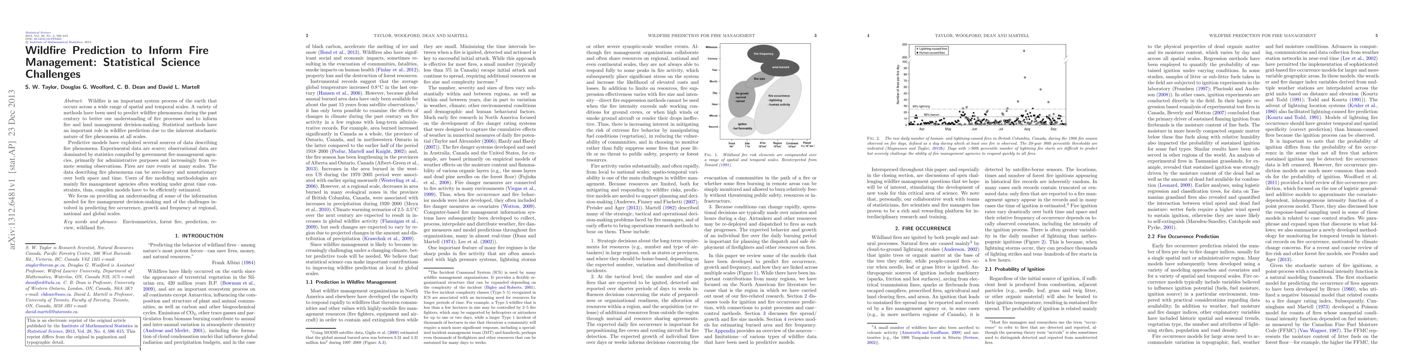 This paper discusses the role of statistical methods in predicting wildfire phenomena to aid fire management, emphasizing the challenges of using limited, often nonstationary data and the need for efficient model estimation under time constraints. It highlights the importance of understanding these challenges for effective fire management decision-making.