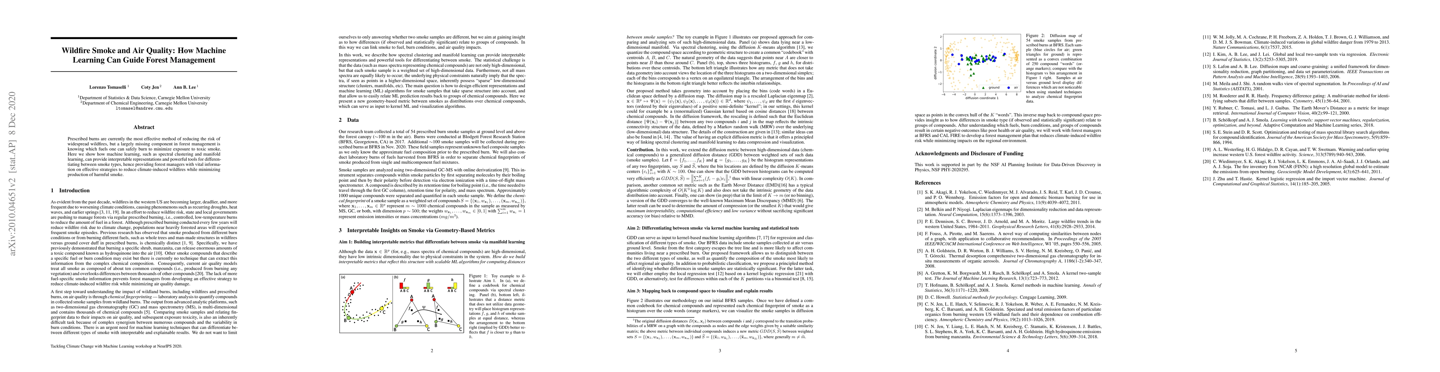 Prescribed burns are currently the most effective method of reducing the risk of widespread wildfires, but a largely missing component in forest management is knowing which fuels one can safely burn to minimize exposure to toxic smoke. Here we show how machine learning, such as spectral clustering and manifold learning, can provide interpretable representations and powerful tools for differentiating between smoke types, hence providing forest managers with vital information on effective strategies to reduce climate-induced wildfires while minimizing production of harmful smoke.