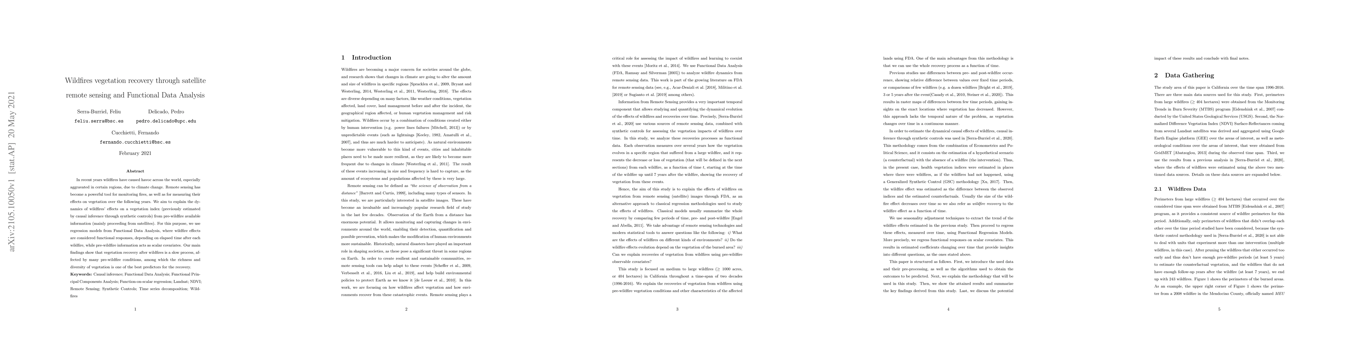 This paper uses satellite remote sensing and Functional Data Analysis to monitor wildfires' impact on vegetation recovery. It finds that vegetation recovery is slow and heavily influenced by pre-wildfire conditions, with vegetation richness and diversity being key predictors.