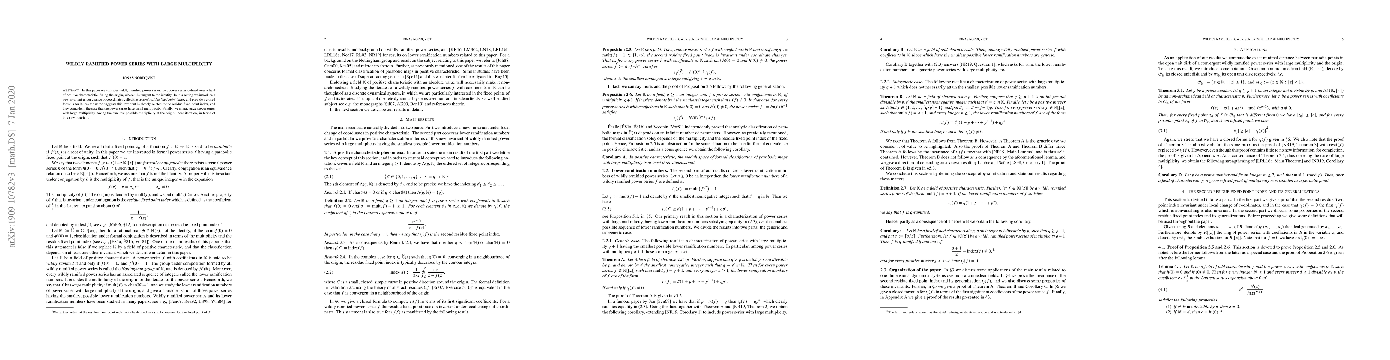 This paper studies wildly ramified power series over fields of positive characteristic, introducing a new invariant called the second residue fixed point index with a closed formula. It characterizes power series with large multiplicity that minimize their multiplicity under iteration, distinguishing them via this new invariant.