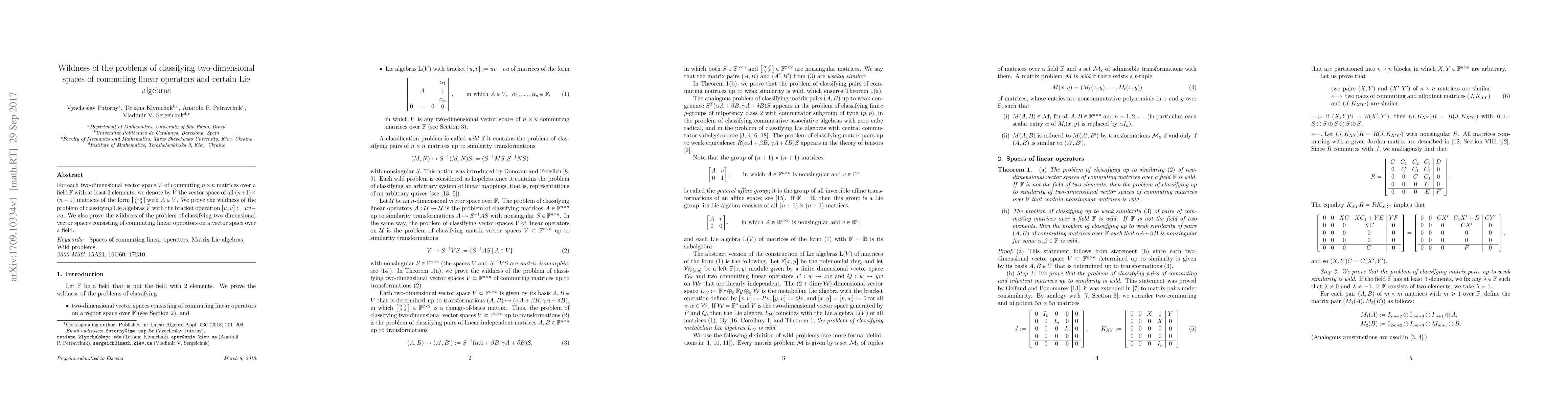 For each two-dimensional vector space $V$ of commuting $n\times n$ matrices over a field $\mathbb F$ with at least 3 elements, we denote by $\widetilde V$ the vector space of all $(n+1)\times(n+1)$ matrices of the form $\left[\begin{smallmatrix}A&*\\0&0\end{smallmatrix}\right]$ with $A\in V$. We prove the wildness of the problem of classifying Lie algebras $\widetilde V$ with the bracket operation $[u,v]:=uv-vu$. We also prove the wildness of the problem of classifying two-dimensional vector spaces consisting of commuting linear operators on a vector space over a field.