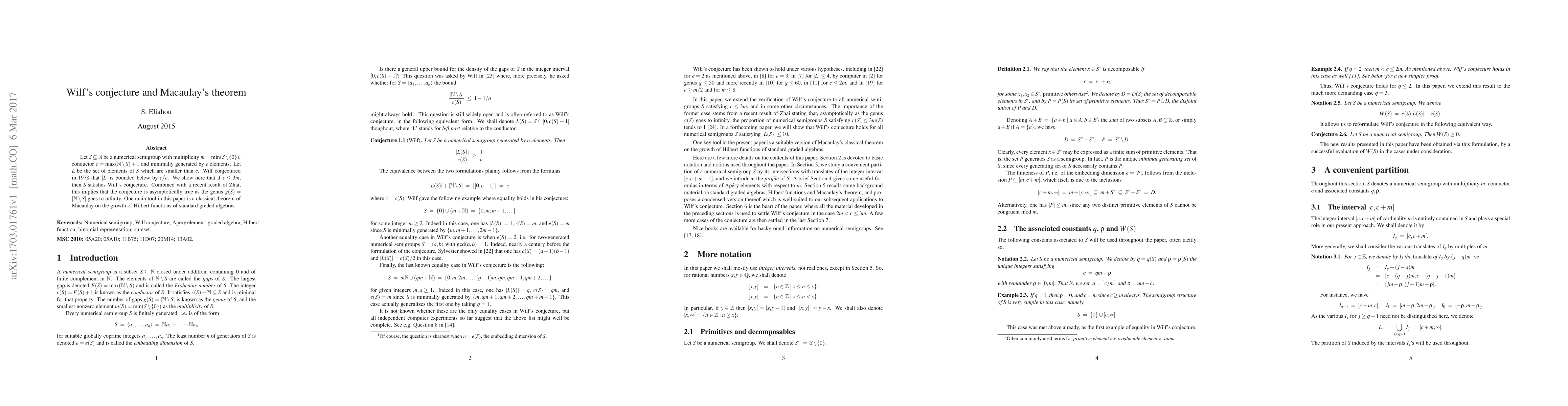 Let S $\subseteq$ N be a numerical semigroup with multiplicity m = min(S \ {0}), conductor c = max(N \ S) + 1 and minimally generated by e elements. Let L be the set of elements of S which are smaller than c. Wilf conjectured in 1978 that |L| is bounded below by c/e. We show here that if c $\le$ 3m, then S satisfies Wilf's conjecture. Combined with a recent result of Zhai, this implies that the conjecture is asymptotically true as the genus g(S) = |N \ S| goes to infinity. One main tool in this paper is a classical theorem of Macaulay on the growth of Hilbert functions of standard graded algebras.