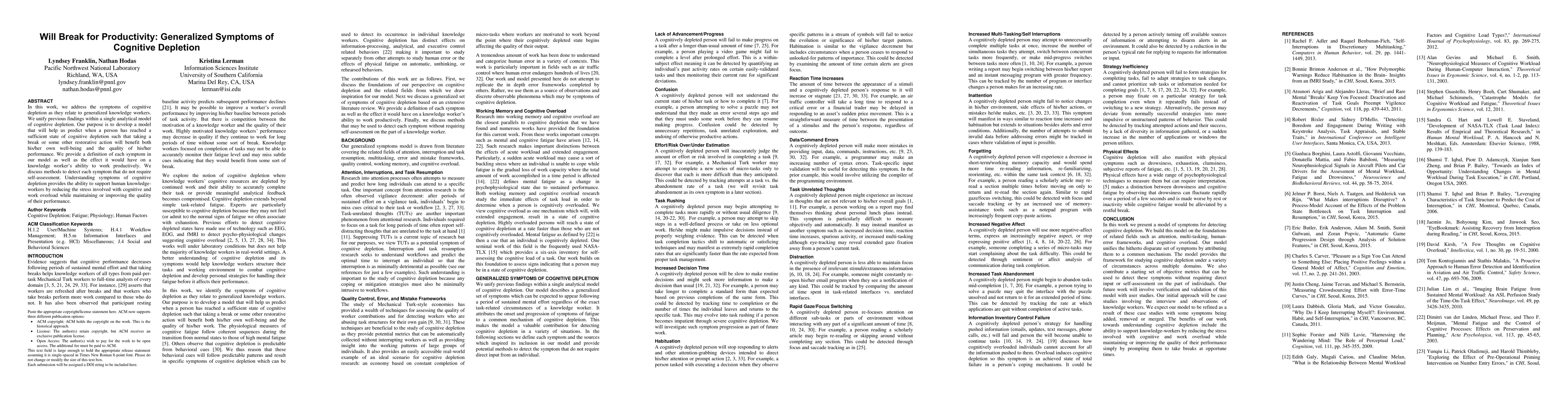 In this work, we address the symptoms of cognitive depletion as they relate to generalized knowledge workers. We unify previous findings within a single analytical model of cognitive depletion. Our purpose is to develop a model that will help us predict when a person has reached a sufficient state of cognitive depletion such that taking a break or some other restorative action will benefit both his or her own wellbeing and the quality of his or her performance. We provide a definition of each symptom in our model as well as the effect it would have on a knowledge worker's ability to work productively. We discuss methods to detect each symptom that do not require self assessment. Understanding symptoms of cognitive depletion provides the ability to support human knowledge workers by reducing the stress involved with cognitive and work overload while maintaining or improving the quality of their performance.