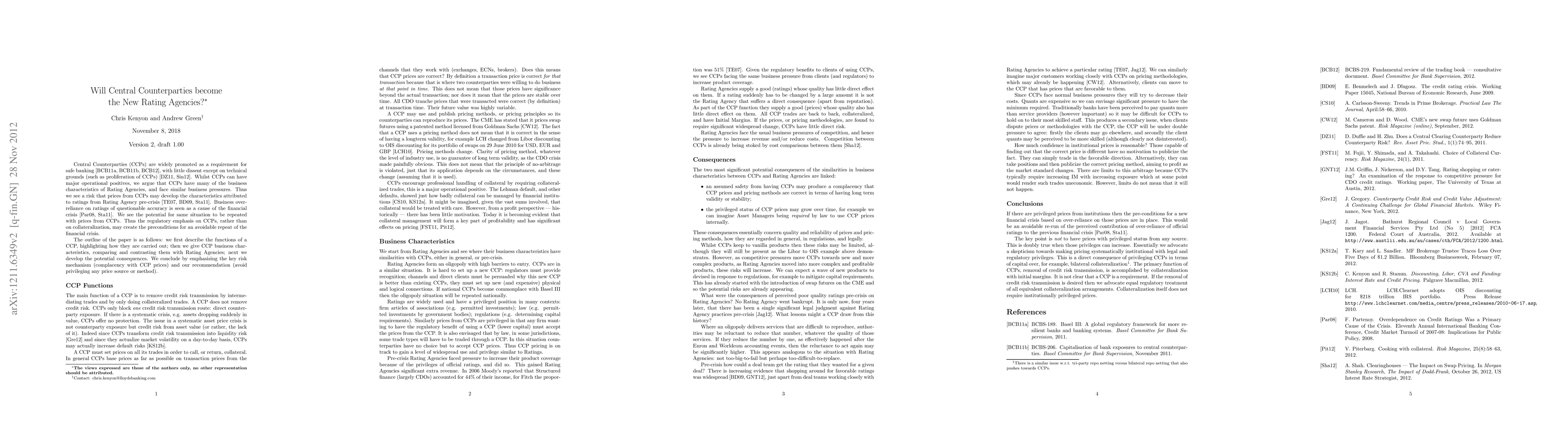 Central Counterparties (CCPs) are widely promoted as a requirement for safe banking with little dissent except on technical grounds (such as proliferation of CCPs). Whilst CCPs can have major operational positives, we argue that CCPs have many of the business characteristics of Rating Agencies, and face similar business pressures. Thus we see a risk that prices from CCPs may develop the characteristics attributed to ratings from Rating Agency pre-crisis. Business over-reliance on ratings of questionable accuracy is seen as a cause of the financial crisis. We see the potential for same situation to be repeated with prices from CCPs. Thus the regulatory emphasis on CCPs, rather than on collateralization, may create the preconditions for an avoidable repeat of the financial crisis.
