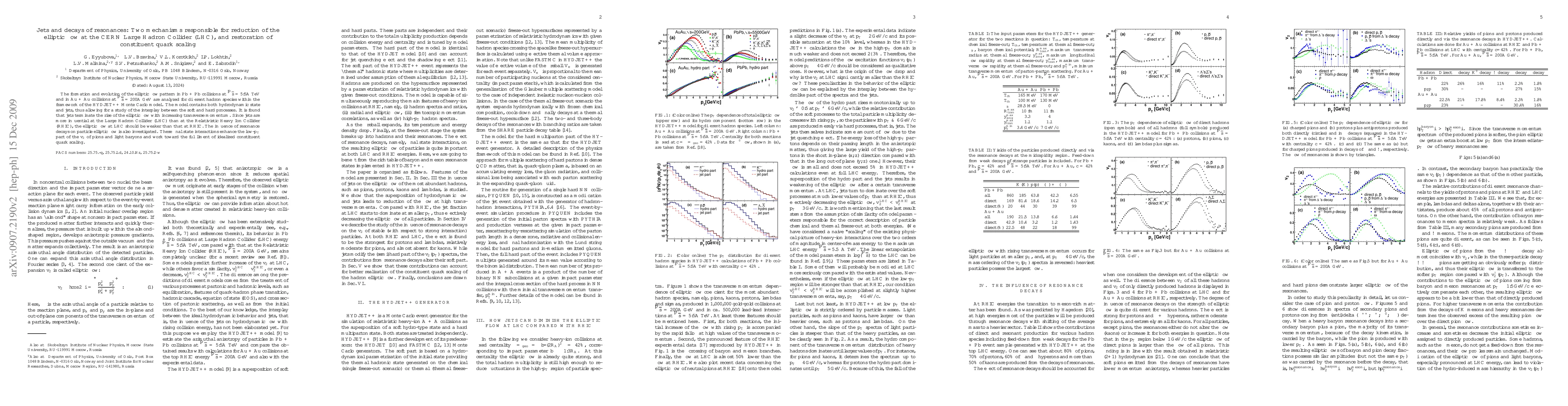 This study using the HYDJET++ model finds that jets reduce the elliptic flow at higher energies, suggesting weaker flow at LHC compared to RHIC. Additionally, resonance decays enhance the low-p_T part of elliptic flow, aiding in the restoration of constituent quark scaling.