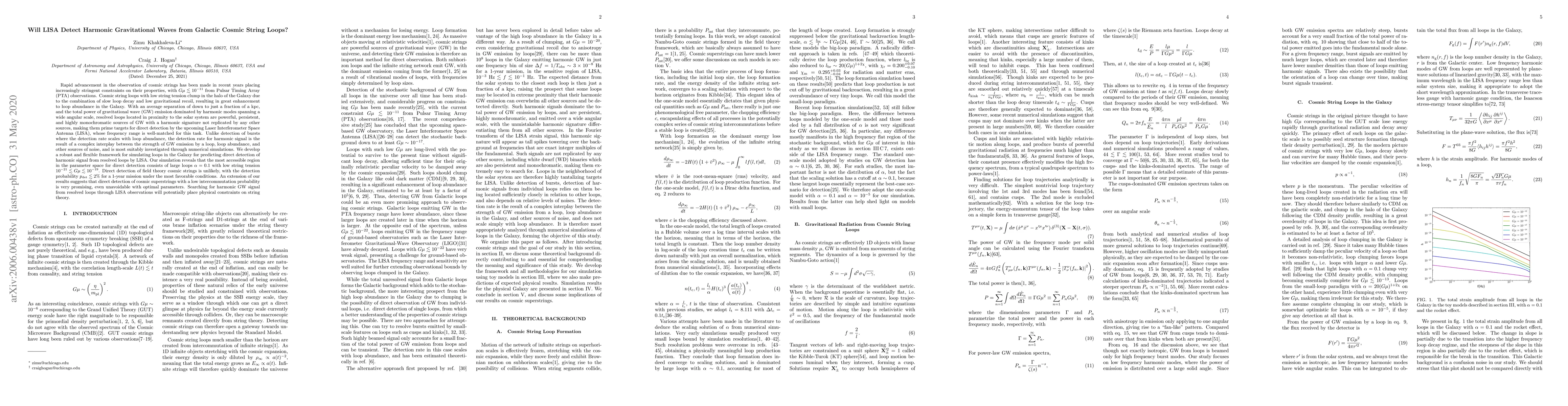 The research explores whether LISA can detect harmonic gravitational waves from galactic cosmic string loops, finding that while detection of large, low-tension loops is possible, the probability of detecting field theory cosmic strings is low at ~2% for a 1-year mission. It suggests that LISA has promising potential for detecting cosmic superstrings with low intercommutation probability.