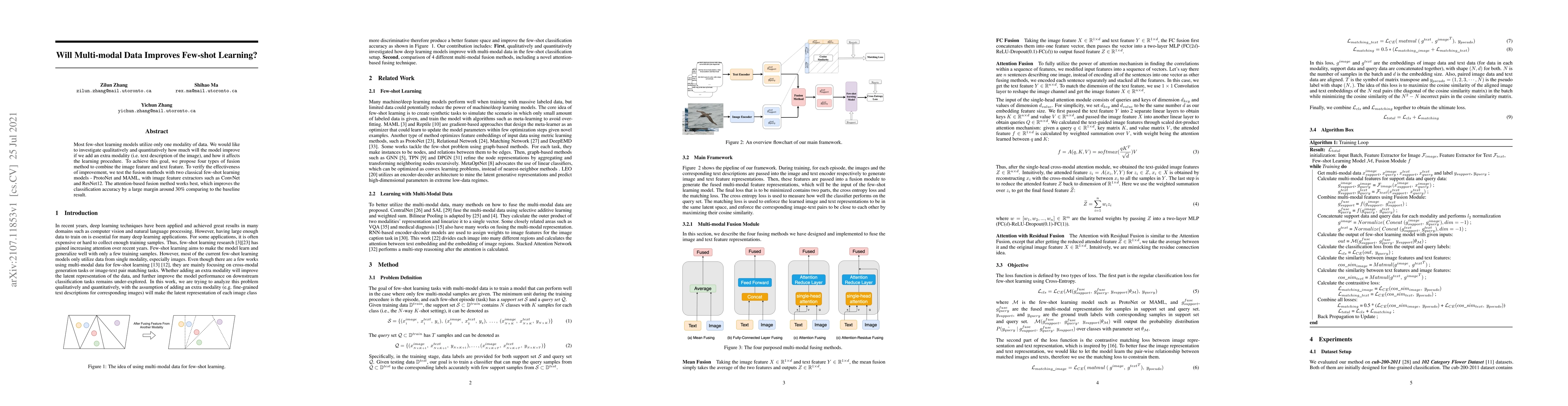 Most few-shot learning models utilize only one modality of data. We would like to investigate qualitatively and quantitatively how much will the model improve if we add an extra modality (i.e. text description of the image), and how it affects the learning procedure. To achieve this goal, we propose four types of fusion method to combine the image feature and text feature. To verify the effectiveness of improvement, we test the fusion methods with two classical few-shot learning models - ProtoNet and MAML, with image feature extractors such as ConvNet and ResNet12. The attention-based fusion method works best, which improves the classification accuracy by a large margin around 30% comparing to the baseline result.