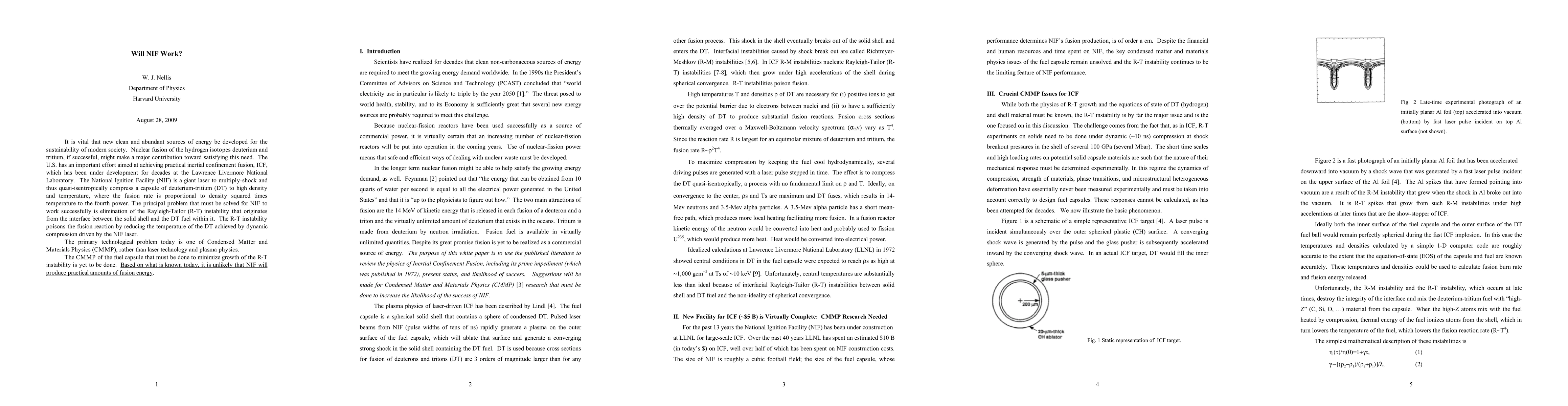 It is vital that new clean and abundant sources of energy be developed for the sustainability of modern society. Nuclear fusion of the hydrogen isotopes deuterium and tritium, if successful, might make a major contribution toward satisfying this need. The U.S. has an important effort aimed at achieving practical inertial confinement fusion, ICF, which has been under development for decades at the Lawrence Livermore National Laboratory. The National Ignition Facility (NIF) is a giant laser to multiply-shock and thus quasi-isentropically compress a capsule of deuterium-tritium (DT) to high density and temperature, where the fusion rate is proportional to density squared times temperature to the fourth power. The principal problem that must be solved for NIF to work successfully is elimination of the Rayleigh-Tailor (R-T) instability that originates from the interface between the solid shell and the DT fuel within it. The R-T instability poisons the fusion reaction by reducing the temperature of the DT achieved by dynamic compression driven by the NIF laser. The primary technological problem today is one of Condensed Matter and Materials Physics (CMMP), rather than laser technology and plasma physics. The CMMP of the fuel capsule that must be done to minimize growth of the R-T instability is yet to be done. Based on what is known today, it is unlikely that NIF will produce practical amounts of fusion energy.