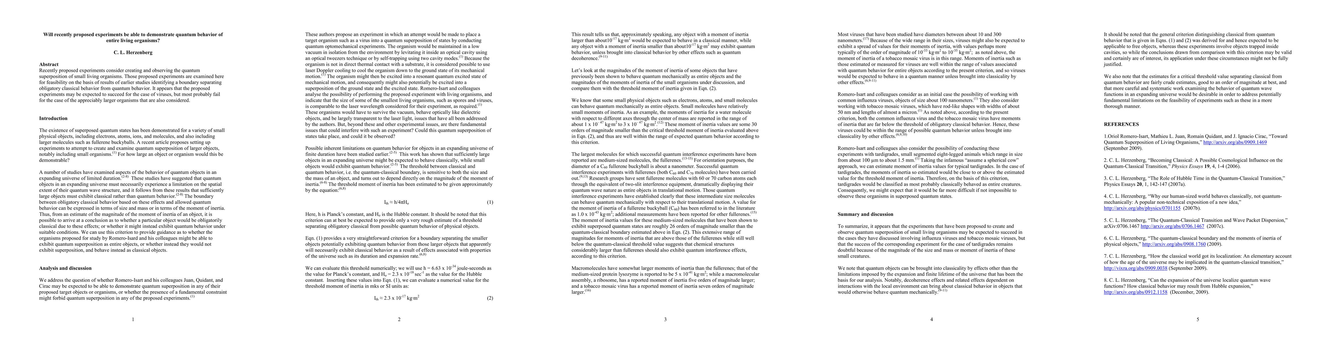 Recent experiments aiming to create quantum superposition in small living organisms like viruses may succeed, but larger organisms are unlikely to exhibit quantum behavior. The study examines feasibility based on earlier boundary studies between obligatory classical and quantum behavior.