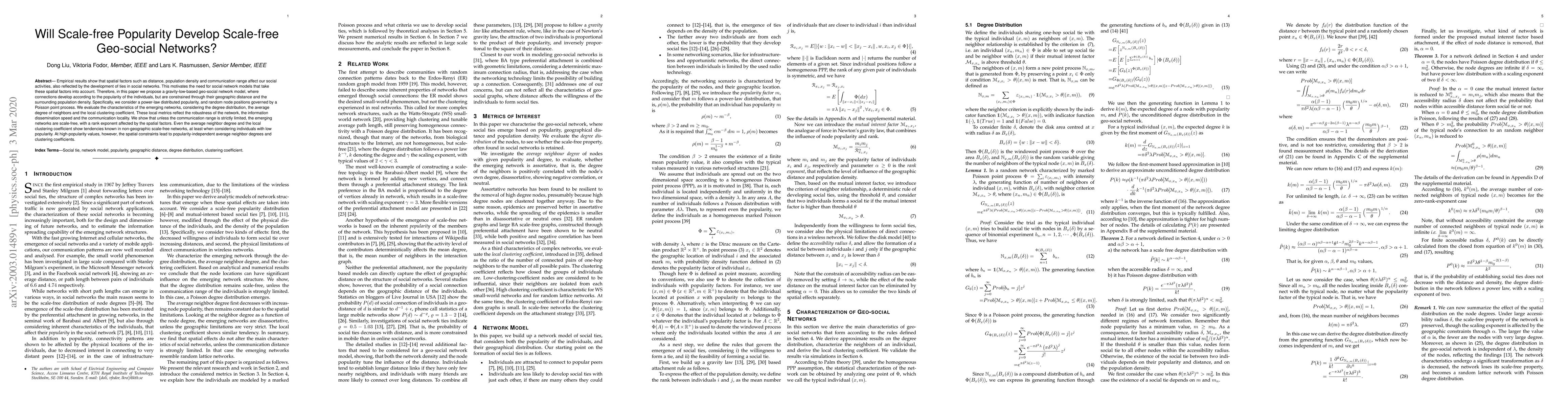 Empirical results show that spatial factors such as distance, population density and communication range affect our social activities, also reflected by the development of ties in social networks. This motivates the need for social network models that take these spatial factors into account. Therefore, in this paper we propose a gravity-low-based geo-social network model, where connections develop according to the popularity of the individuals, but are constrained through their geographic distance and the surrounding population density. Specifically, we consider a power-law distributed popularity, and random node positions governed by a Poisson point process. We evaluate the characteristics of the emerging networks, considering the degree distribution, the average degree of neighbors and the local clustering coefficient. These local metrics reflect the robustness of the network, the information dissemination speed and the communication locality. We show that unless the communication range is strictly limited, the emerging networks are scale-free, with a rank exponent affected by the spatial factors. Even the average neighbor degree and the local clustering coefficient show tendencies known in non-geographic scale-free networks, at least when considering individuals with low popularity. At high-popularity values, however, the spatial constraints lead to popularity-independent average neighbor degrees and clustering coefficients.