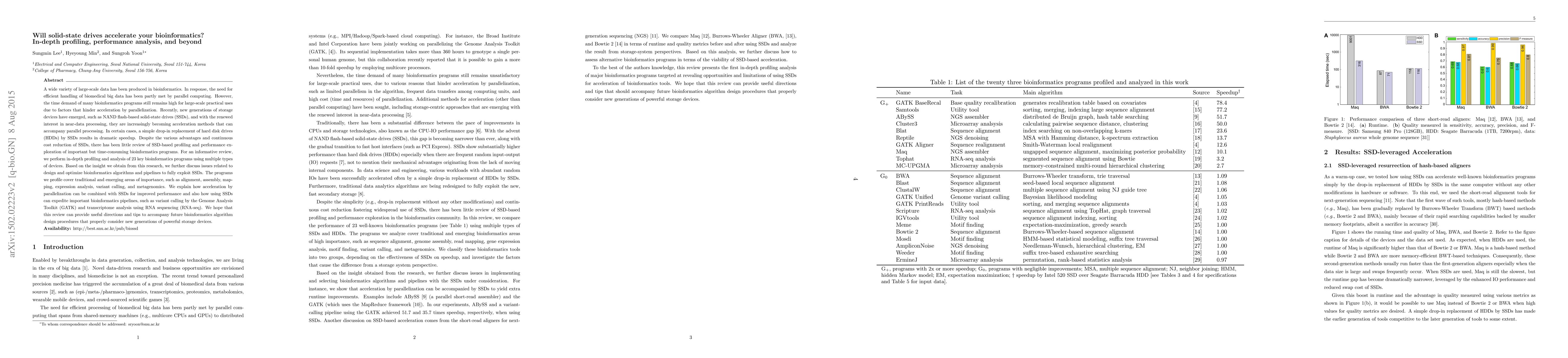 This paper conducts an in-depth profiling and performance analysis of 23 key bioinformatics programs to evaluate the impact of using solid-state drives (SSDs) over traditional hard disk drives (HDDs). The study finds that SSDs can significantly accelerate bioinformatics tasks, especially when combined with parallel processing, and provides insights for optimizing bioinformatics algorithms to leverage SSD benefits.