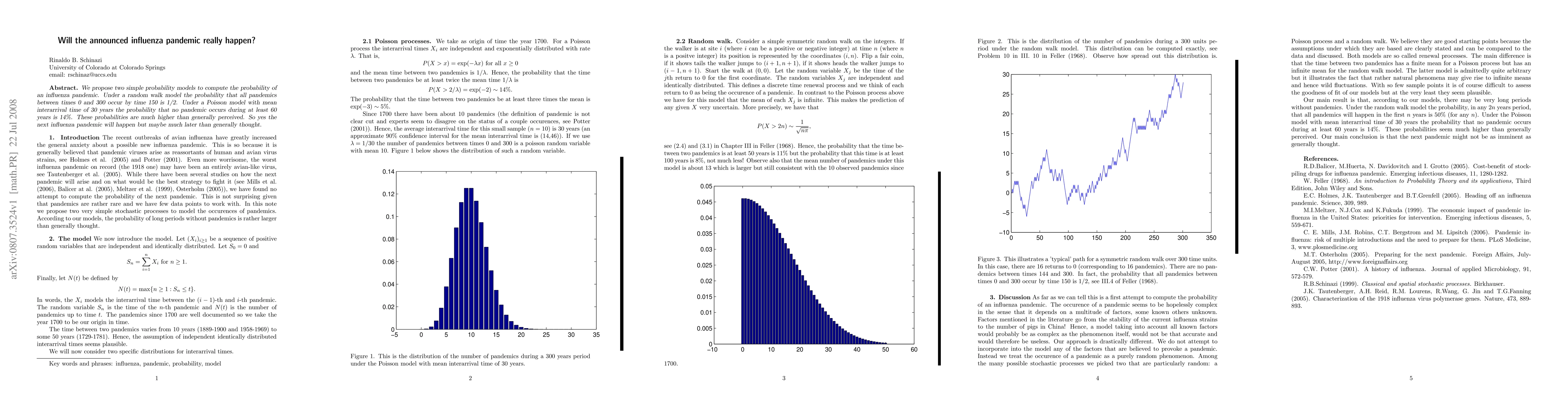 We propose two simple probability models to compute the probability of an influenza pandemic. Under a random walk model the probability that all pandemics between times 0 and 300 occur by time 150 is 1/2. Under a Poisson model with mean inter arrival time of 30 years the probability that no pandemic occurs during at least 60 years is 14%. These probabilities are much higher than generally perceived. So yes the next influenza pandemic will happen but maybe much later than generally thought.
