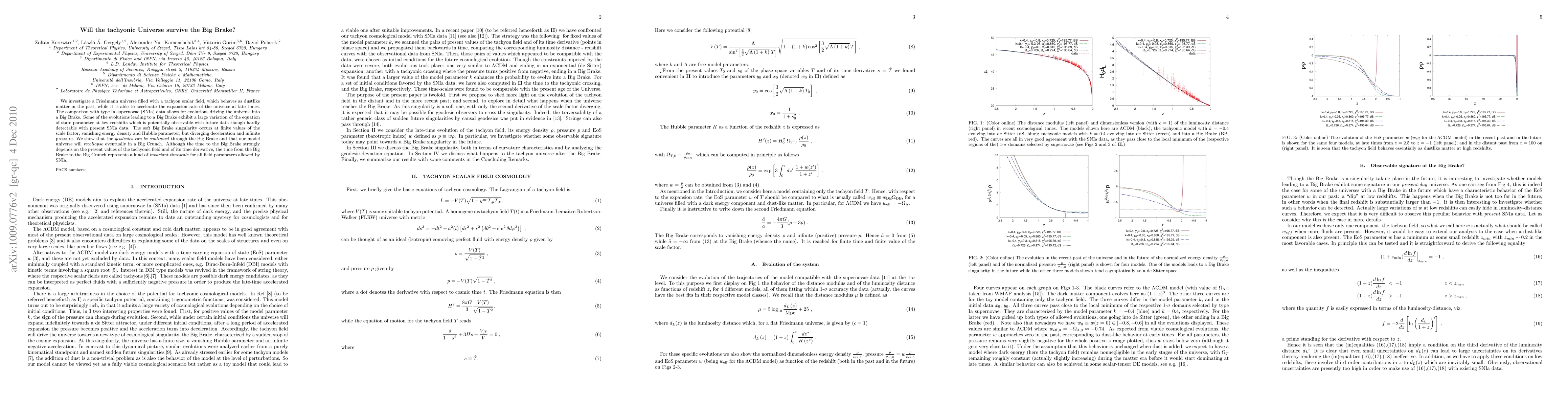 We investigate a Friedmann universe filled with a tachyon scalar field, which behaves as dustlike matter in the past, while it is able to accelerate the expansion rate of the universe at late times. The comparison with type Ia supernovae (SNIa) data allows for evolutions driving the universe into a Big Brake. Some of the evolutions leading to a Big Brake exhibit a large variation of the equation of state parameter at low redshifts which is potentially observable with future data though hardly detectable with present SNIa data. The soft Big Brake singularity occurs at finite values of the scale factor, vanishing energy density and Hubble parameter, but diverging deceleration and infinite pressure. We show that the geodesics can be continued through the Big Brake and that our model universe will recollapse eventually in a Big Crunch. Although the time to the Big Brake strongly depends on the present values of the tachyonic field and of its time derivative, the time from the Big Brake to the Big Crunch represents a kind of invariant timescale for all field parameters allowed by SNIa.