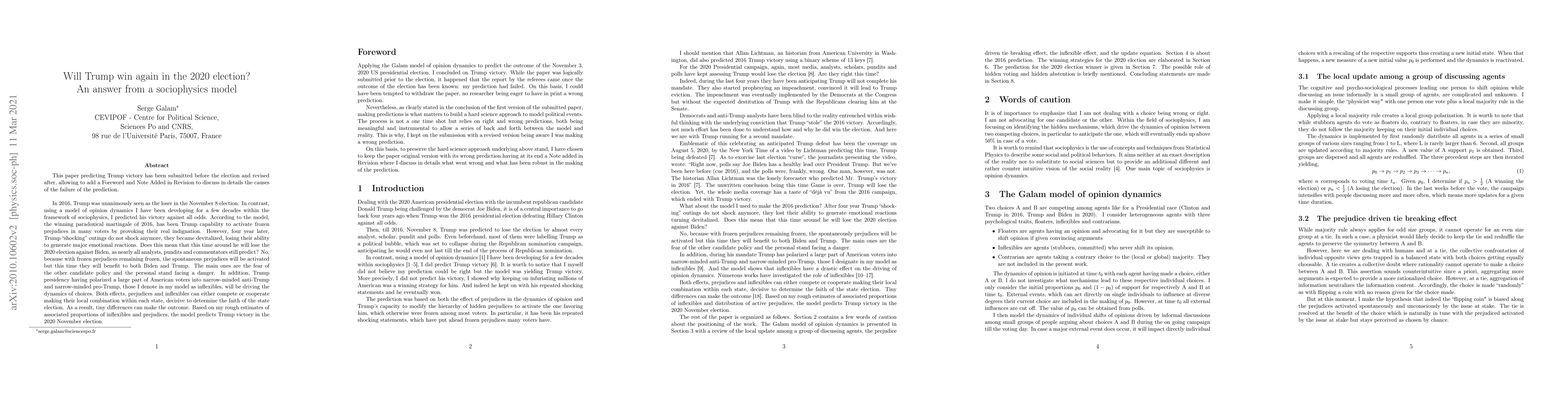 A sociophysics model predicts Trump's victory in the 2020 election despite widespread predictions of a Biden win, citing the activation of both emotional prejudices and inflexible voters to influence state-level outcomes.