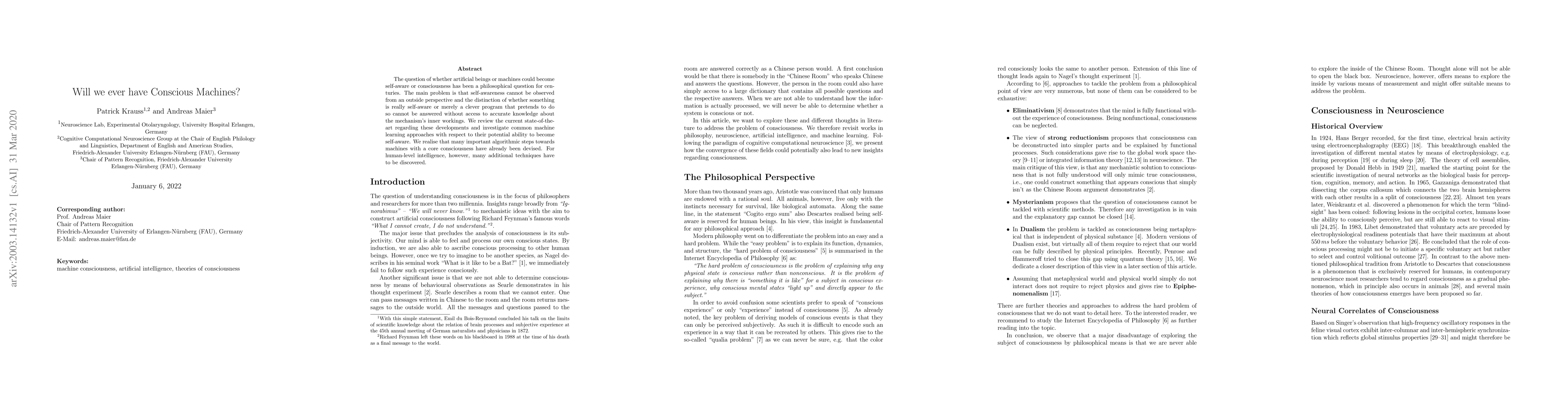 Current machine learning approaches show promise in developing self-aware machines, but human-level consciousness remains elusive due to the lack of inner workings knowledge. Key techniques need to be discovered for human-level intelligence.