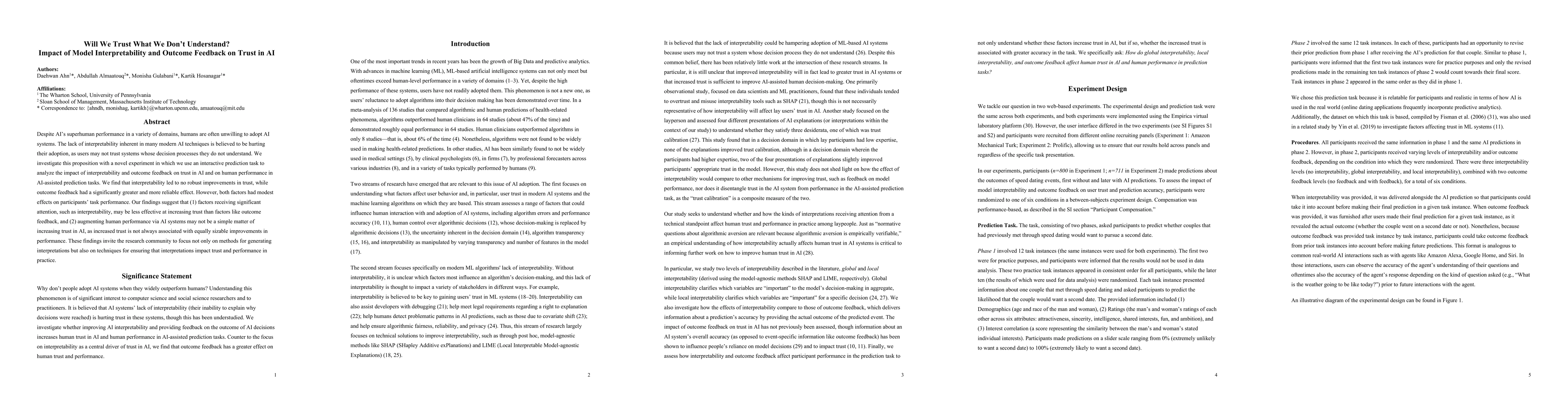 This study explores how model interpretability and outcome feedback influence trust in AI and human performance in AI-assisted tasks. Despite the focus on interpretability, it found no significant improvement in trust, while outcome feedback had a more substantial effect. The research suggests that trust and performance improvements are not always aligned, urging the research community to prioritize both interpretability and effective feedback mechanisms.