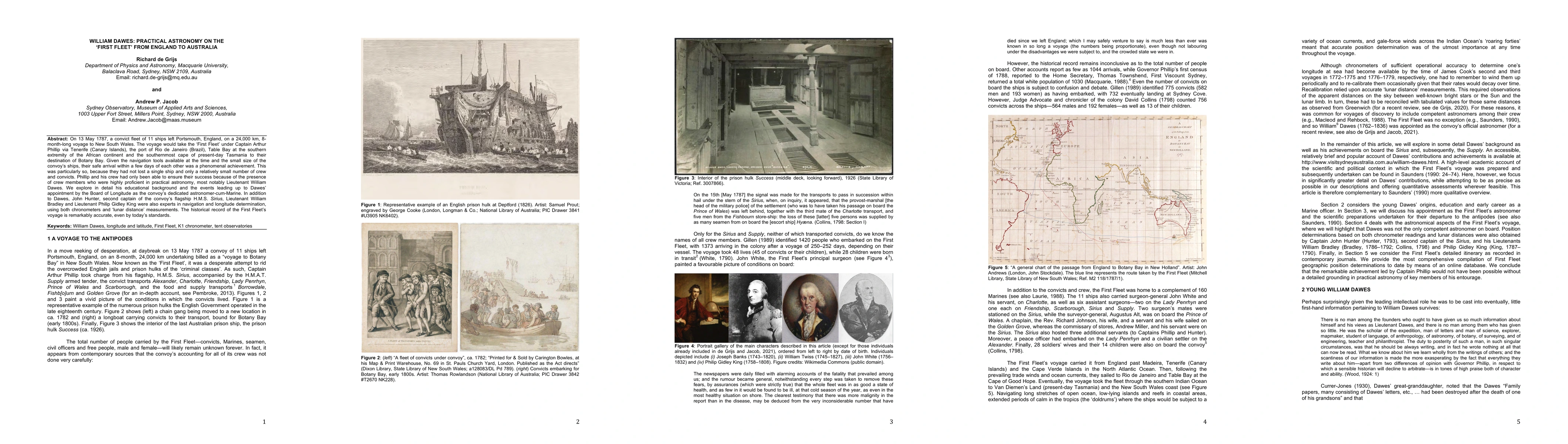 On 13 May 1787, a convict fleet of 11 ships left Portsmouth, England, on a 24,000 km, 8-month-long voyage to New South Wales. The voyage would take the "First Fleet" under Captain Arthur Phillip via Tenerife (Canary Islands), the port of Rio de Janeiro (Brazil), Table Bay at the southern extremity of the African continent and the southernmost cape of present-day Tasmania to their destination of Botany Bay. Given the navigation tools available at the time and the small size of the convoy's ships, their safe arrival within a few days of each other was a phenomenal achievement. This was particularly so, because they had not lost a single ship and only a relatively small number of crew and convicts. Phillip and his crew had only been able to ensure their success because of the presence of crew members who were highly proficient in practical astronomy, most notably Lieutenant William Dawes. We explore in detail his educational background and the events leading up to Dawes' appointment by the Board of Longitude as the convoy's dedicated astronomer-cum-Marine. In addition to Dawes, John Hunter, second captain of the convoy's flagship H.M.S. Sirius, Lieutenant William Bradley and Lieutenant Philip Gidley King were also experts in navigation and longitude determination, using both chronometers and "lunar distance" measurements. The historical record of the First Fleet's voyage is remarkably accurate, even by today's standards.