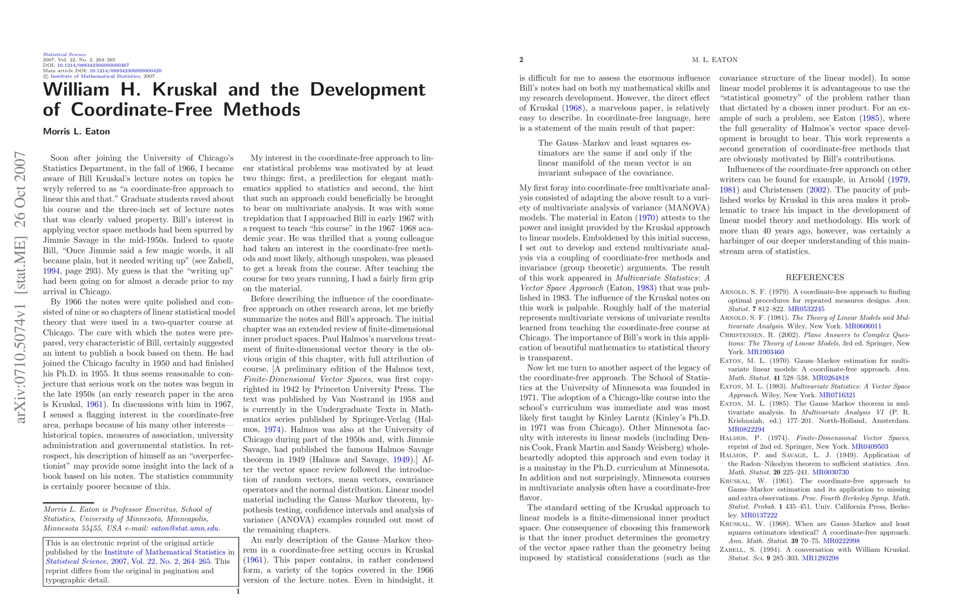 Discussion of ``The William Kruskal Legacy: 1919--2005'' by Stephen E. Fienberg, Stephen M. Stigler and Judith M. Tanur [arXiv:0710.5063]